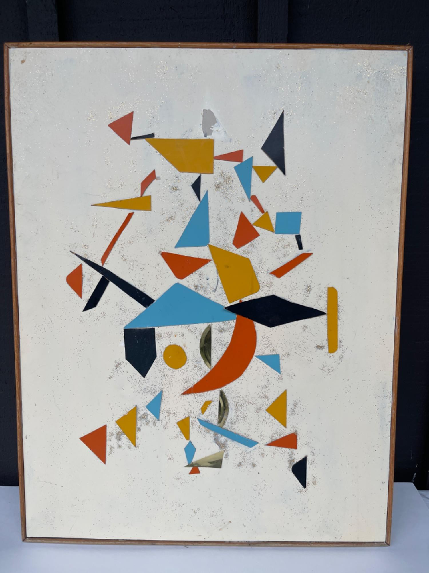 This is an original abstract geometric painting. Abstract Nature: Features various colored geometric shapes arranged in a balanced composition. Visual Appeal: Intriguing and thought-provoking, suitable for modern decor. Paint on Canvas or Paper: Likely created using paint on either canvas or paper. Abstract art, particularly geometric abstraction, emerged in the early 20th century as artists sought to break away from traditional representational art. This style focuses on the use of shapes, colors, and forms to convey meaning and evoke emotions, often leaving interpretation up to the viewer. This piece reflects the ongoing influence of abstract art in contemporary artistic expression.