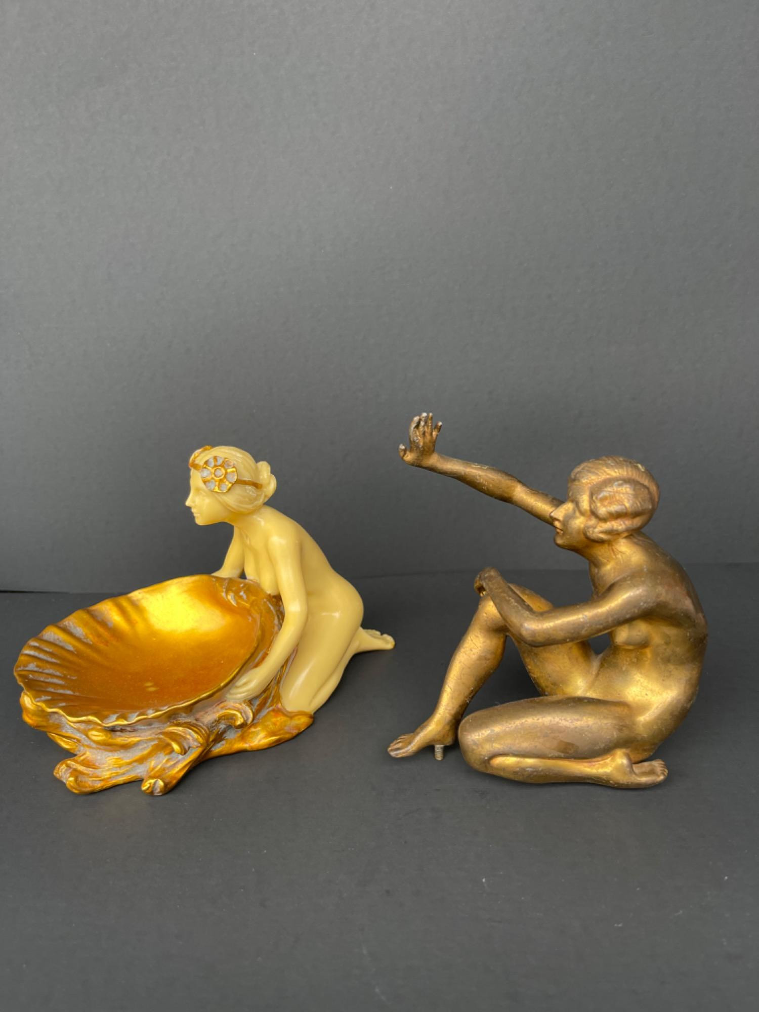 Art Nouveau Trinket Dish and Pot Metal Woman Figural Both 5 “ tall. Pot metal item was affixed to something at one time, please see closeup of hand, some damage.