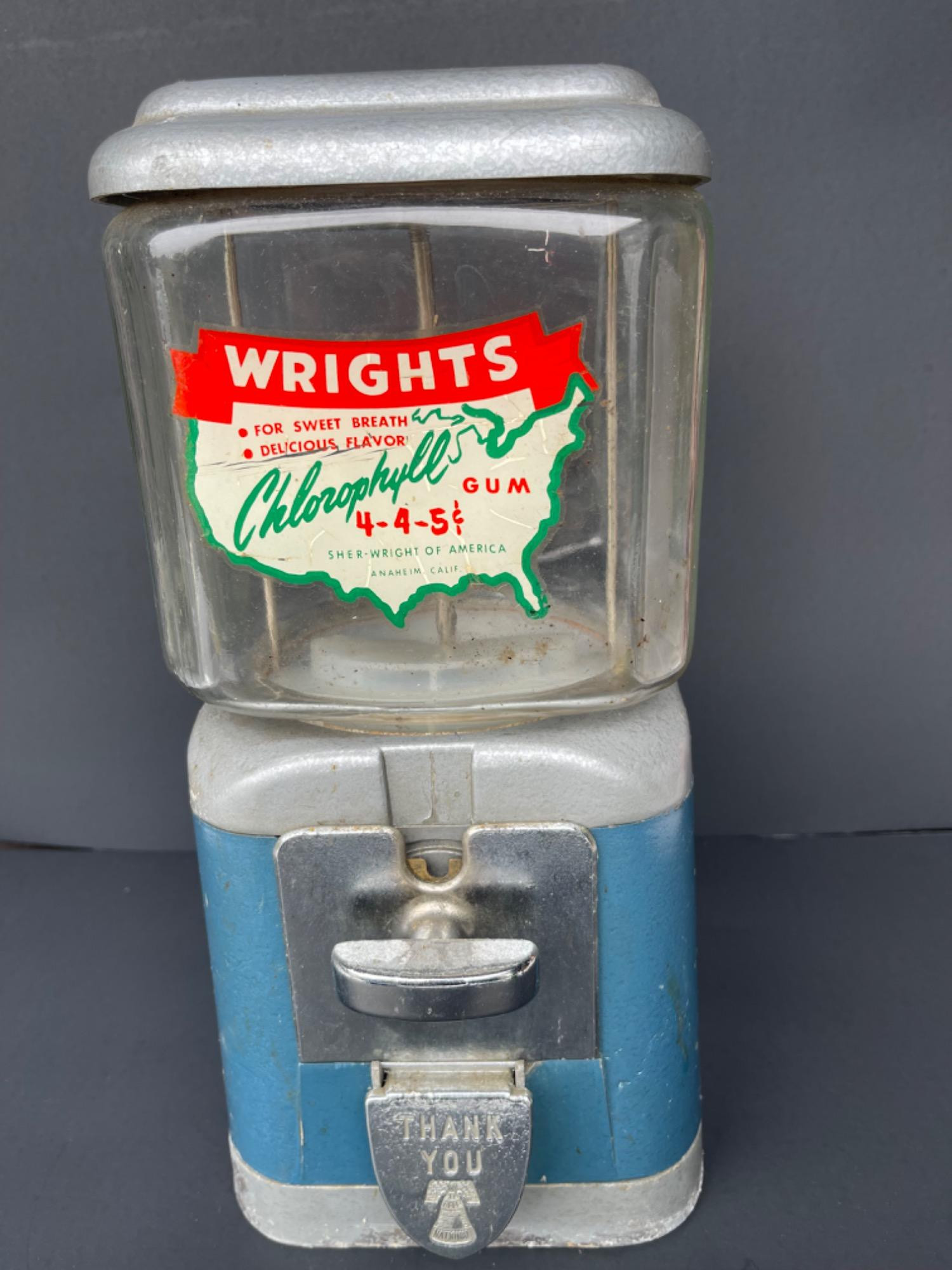 This is a vintage Bell National Gum Machine, specifically branded for Wright’s Silver Bright Chewing Gum. Vintage Appeal: A collectible coin-operated vending machine. Brand Specificity: Features branding for Wright’s Silver Bright Chewing Gum. Functionality: Designed to dispense chewing gum. Metal and Glass: The machine is made of metal with a glass globe for displaying the gum. Bell National Gum Machines were popular in the mid-20th century, often found in stores and public places. This particular model, branded for Wright’s gum, reflects the era’s marketing and vending technology. Collectors value these machines for their nostalgic appeal and historical significance in the evolution of vending machines.