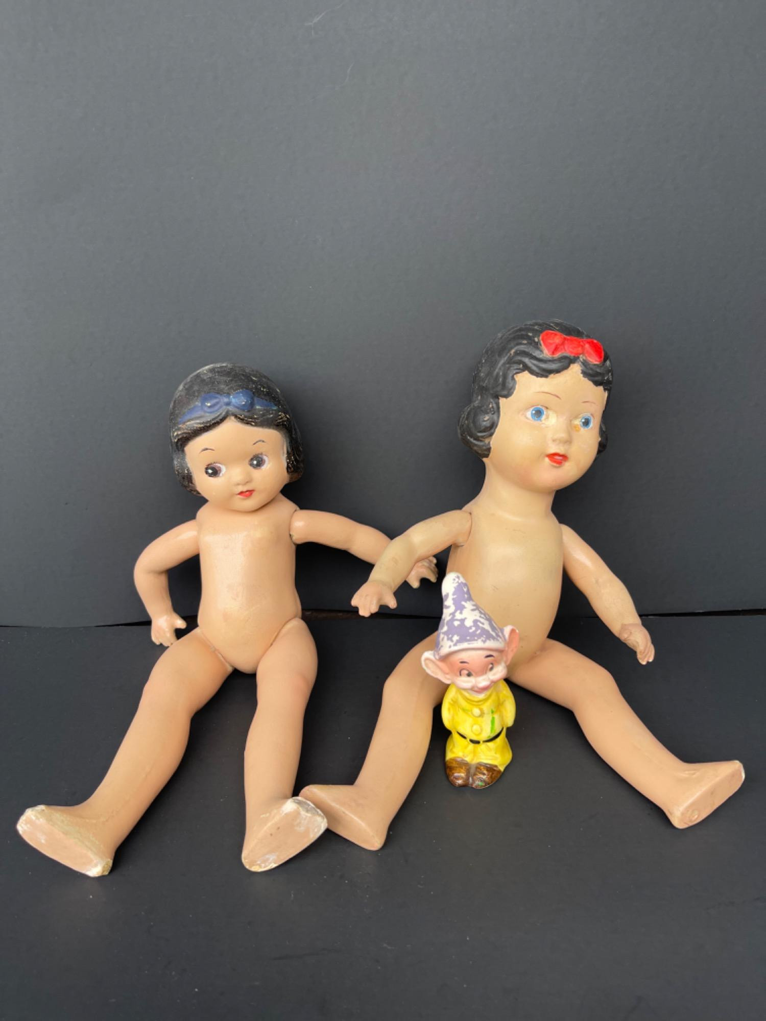 Two vintage-style dolls and a dwarf figurine, inspired by the Snow White fairy tale. Design: Dolls with blue and red bows, articulated limbs, and a dwarf figurine. Connection: Inspired by Snow White and the Seven Dwarfs. Size: Dolls are 12 inches tall. Material: Likely made of painted plastic or similar synthetic material. These items may have historical value as collectibles or toys from a specific era related to the Snow White fairy tale, particularly Disney’s adaptation. Their vintage appearance and connection to a beloved story add to their collectible appeal.