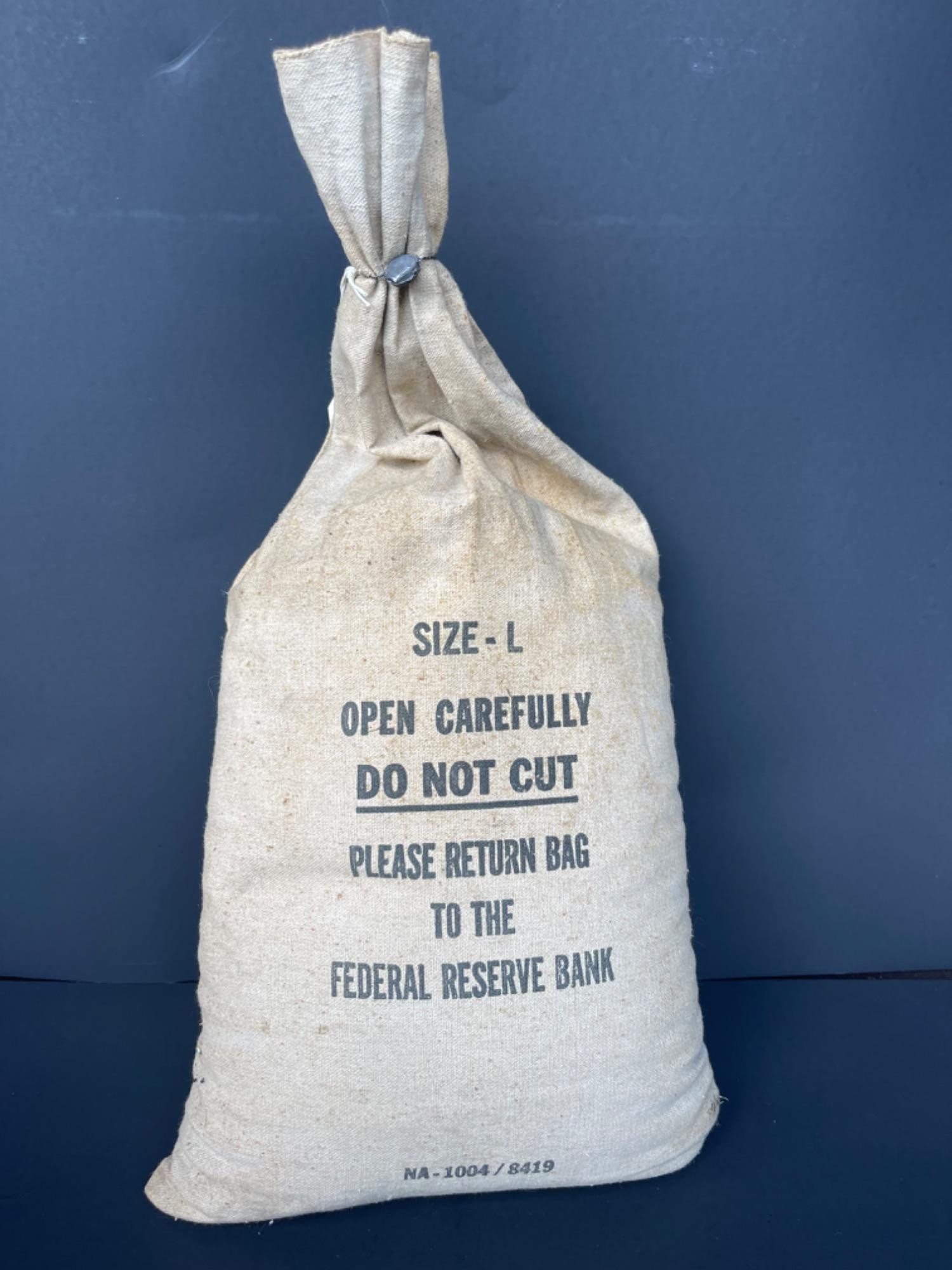 Item/s: A Federal Reserve money bag filled with shredded currency.