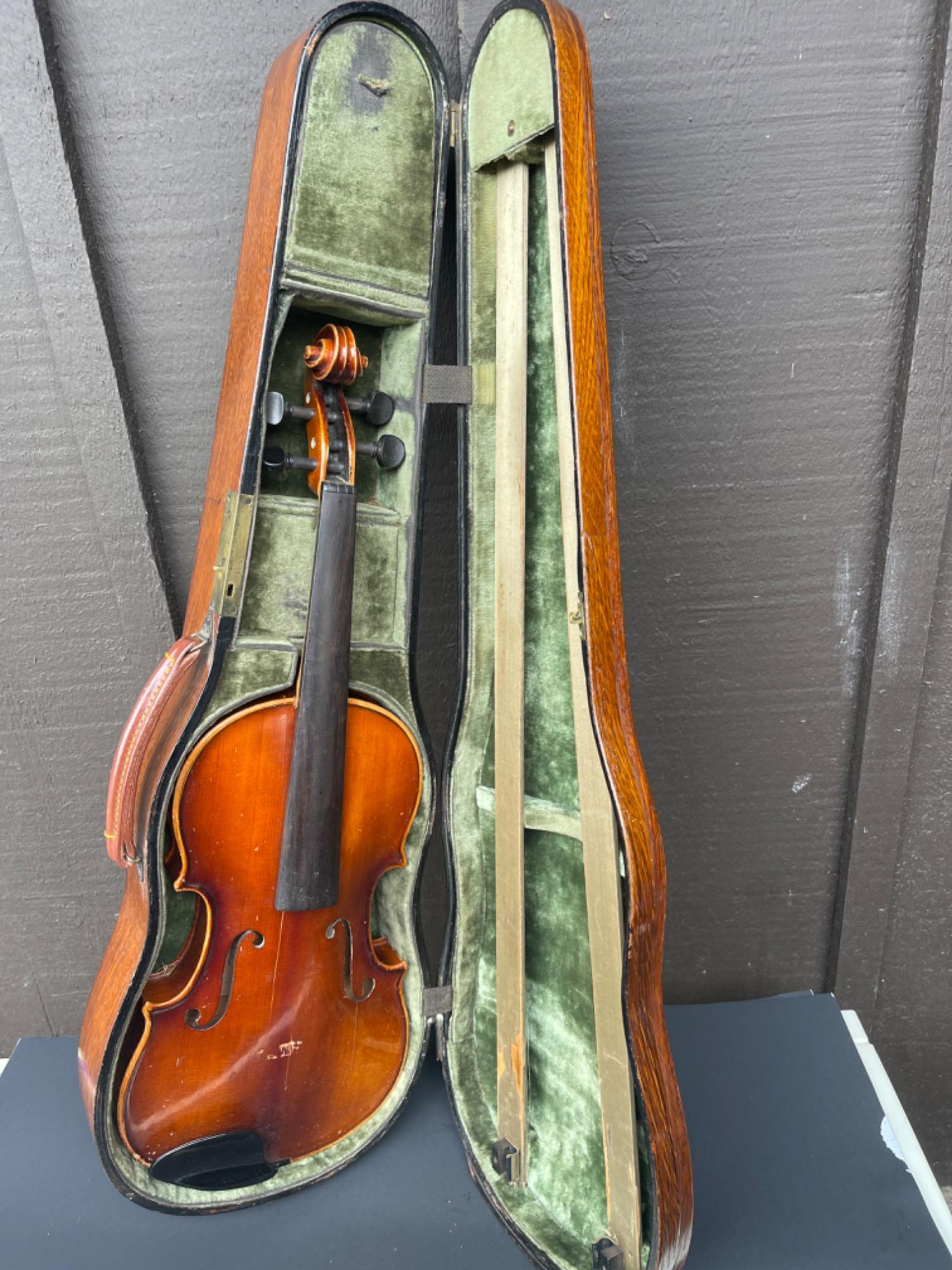 A beautifully crafted vintage violin, showcasing elegance and fine detail. Early to mid-20th century Shows visible signs of use Features classic design with a warm finish Ideal for musicians, collectors, and enthusiasts Constructed from high-quality spruce (top), maple (back and sides), and ebony (fingerboard). Reflects a rich tradition of violin making, known for its distinctive sound and craftsmanship.
