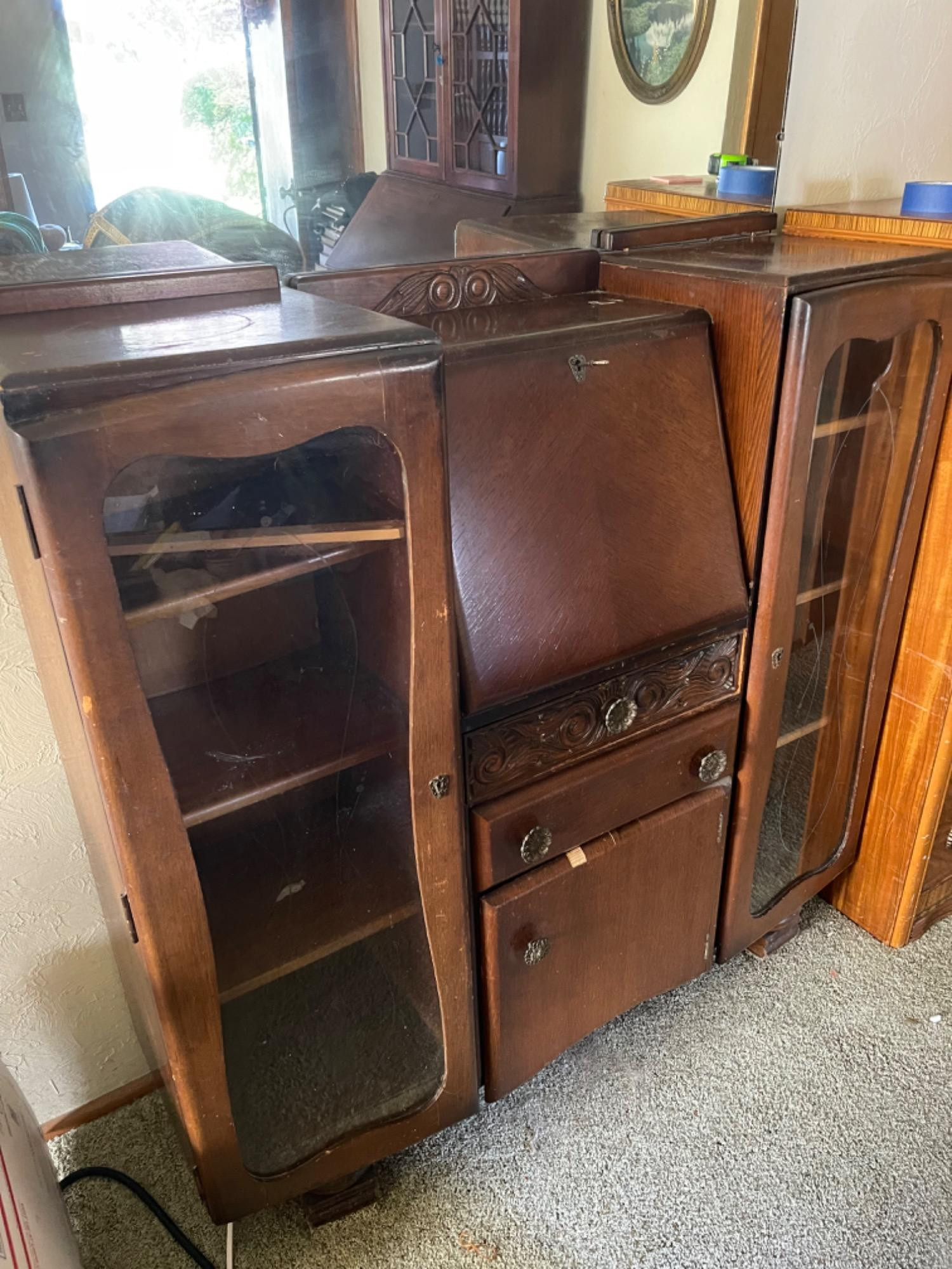 Item: A vintage wooden secretary cabinet with intricate carvings, a fold-down writing surface, multiple drawers, and glass-fronted display sections. Combines storage with a writing space. Materials: Made of wood with glass panels. Dimensions: Approximately 48 inches wide, 48 inches tall, 13 inches deep. History: Popular in the 18th and 19th centuries, these cabinets were used by professionals and academics for their multifunctional design.