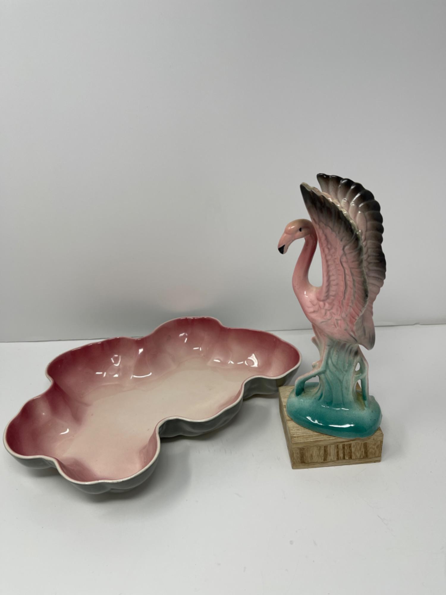Flamingo and Los Angeles Pottery Item: A vintage ceramic flamingo figurine paired with a matching leaf-shaped dish. Takeaways: Material: Glazed ceramic or porcelain. Design: Features a pink flamingo and a leaf dish with pink and white gradients. Era: Mid-20th century, typical of Los Angeles Pottery’s vibrant and whimsical designs. History: Los Angeles Pottery is known for its colorful and artistic ceramic pieces, popular among collectors for their unique and playful styles. Measurement: Flamingo is not marked it measures 8 1/2 inches tall base 3 inches pottery dish. It’s marked 295-1952 and it measures about 11 1/2 inches long by 2 inches tall by 8 1/2 inches wide.