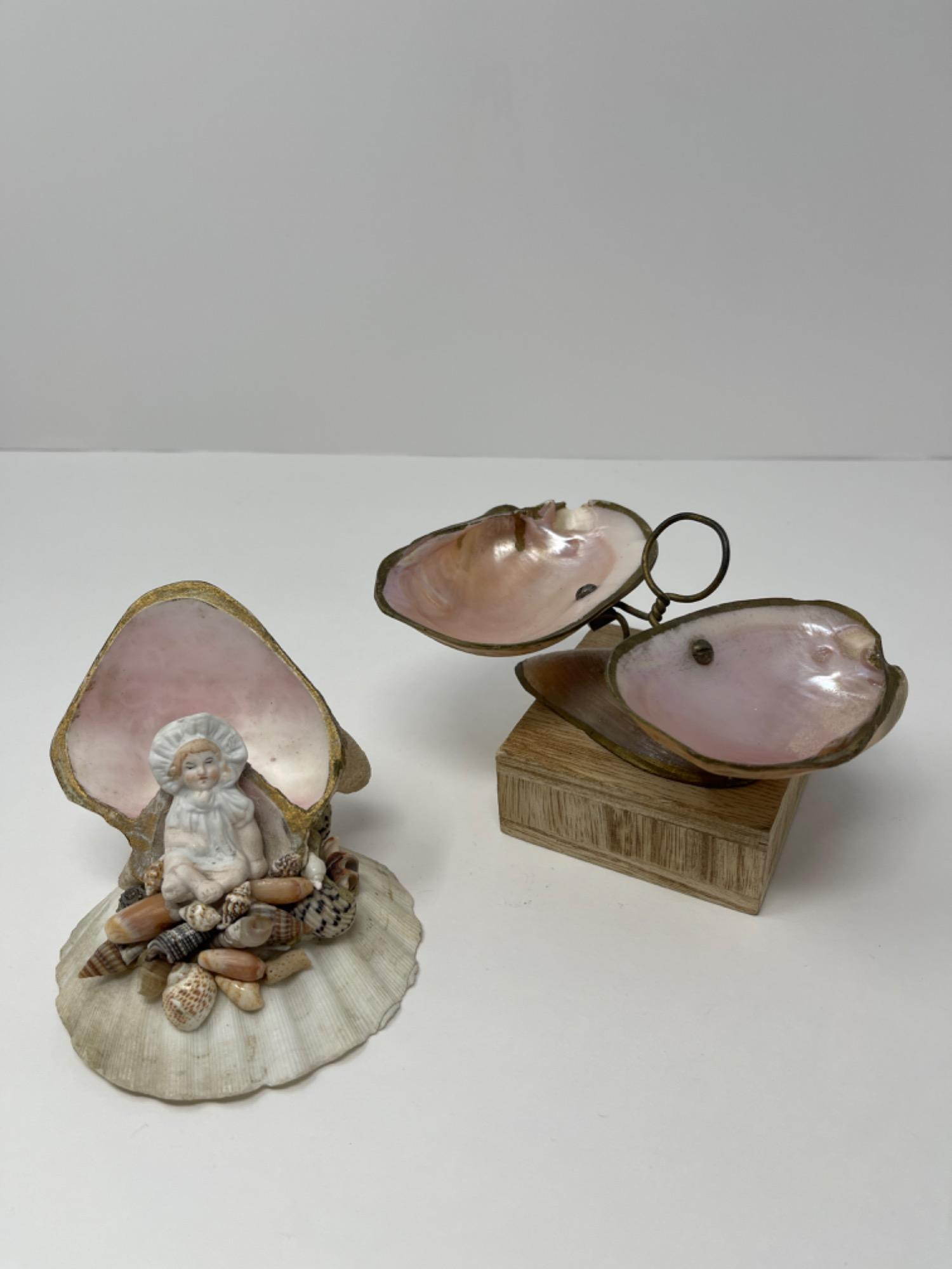 Item: A vintage seashell ring holder and a piece of shell art featuring a religious icon. Takeaways: Material: Seashells, metal (ring holder), and wood (base for shell art). Design: Ring holder with seashells; shell art with a religious icon. Visible damage or wear. History: These items are decorative pieces, possibly created for religious or Measurement: Ring Holder- 5 x 1.5 tall Shell With Figurine- 3 x 4 Both have cracks in shell, see pictures