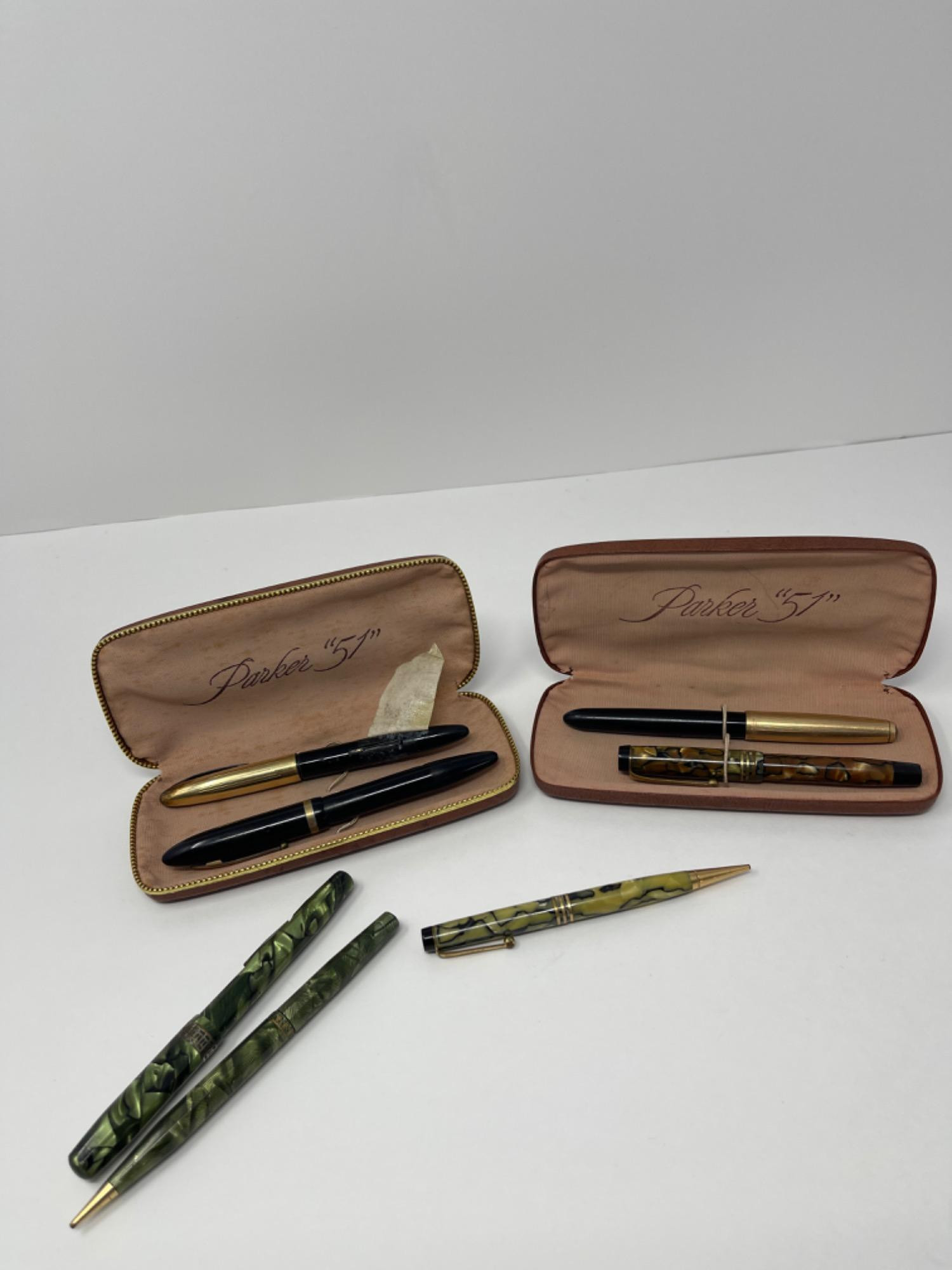 Item: A collection of Parker 51 fountain and calligraphy pens, including their original cases. Takeaways: Material: Resin bodies, metal clips, possibly gold or gold-plated nibs. Design: Includes a green marbled pen and a black and gold pen. Well-preserved with original cases. History: The Parker 51 series, introduced in the 1940s, became one of the most popular and iconic fountain pens, known for their sleek design and reliable performance. Parker green is a mechanical pencil. One set seems to be mismatched pins and telegraphy pins were not tested.