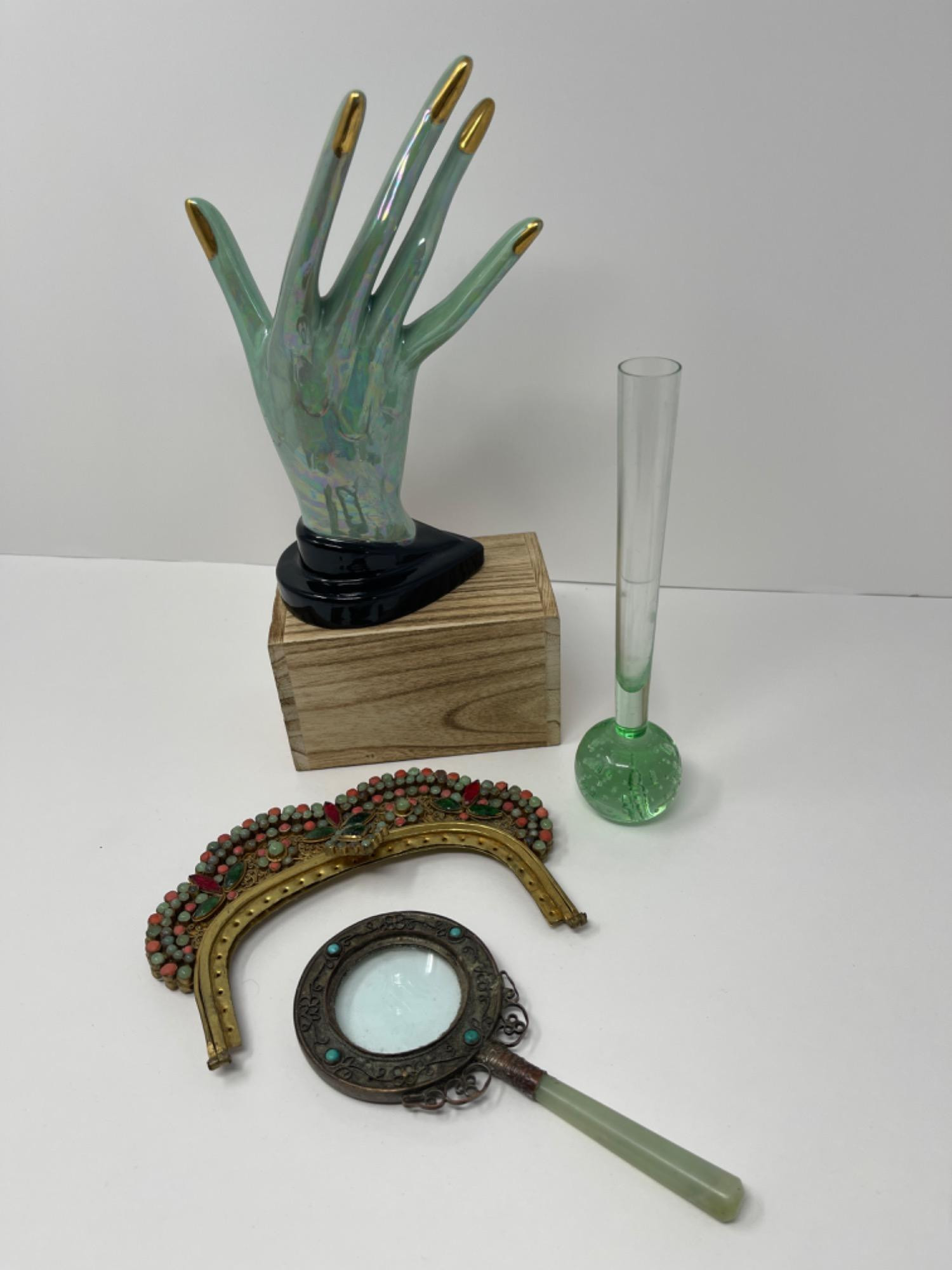Item: A collection including a decorative hand sculpture, a beaded purse fastener, an ornate handheld mirror, and a slender glass vase. Takeaways: Material: Metal (hand sculpture), beads (purse fastener), metal and glass (mirror), glass (vase). Design: Intricate and ornate, reflecting vintage craftsmanship. Appears well-preserved, with detailed designs. History: These items likely date back to the early to mid-20th century, showcasing the decorative styles and materials popular during that era. Measurement: 6.5 Mirror hand- 8.5 T hand- 8.75