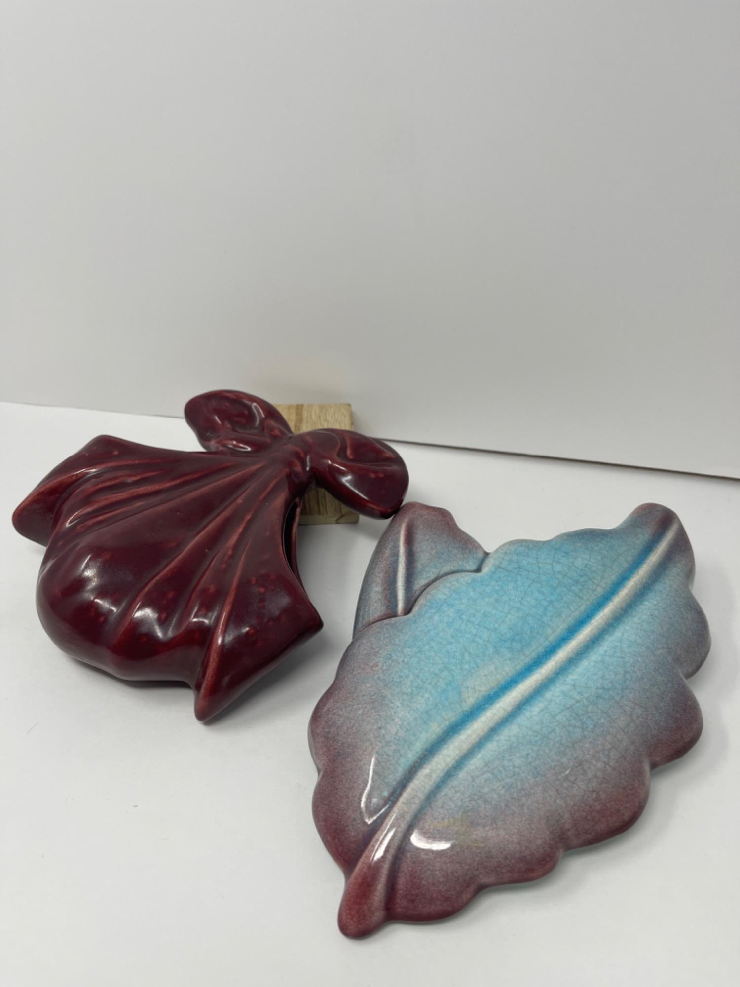 Item/s: A set of two ceramic wall pockets, one by McCoy and the other by La Mirada, both featuring leaf designs. Takeaways: Material: Glazed ceramic. Design: Leaf-inspired shapes with distinct color palettes (maroon and blue/pink). Era: Mid-20th century, reflecting popular decorative styles. History: McCoy and La Mirada are known for their high-quality ceramics, popular in mid-20th century America for their decorative and functional art pieces. Measurement: Leaf-9.5 x 6