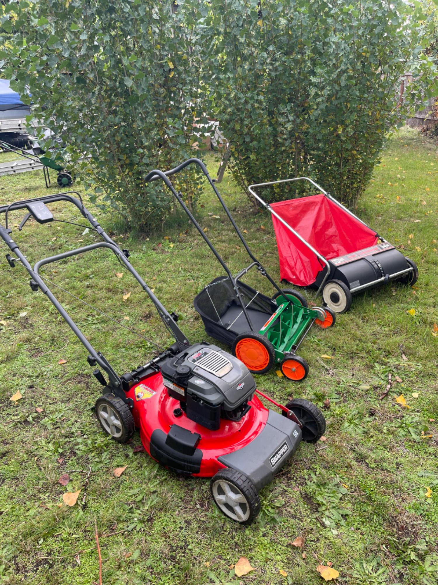 Snapper Gas Powered Lawn Mower, Scotts Push Mower, Leaf Lawnsweep. All work! Great condition.