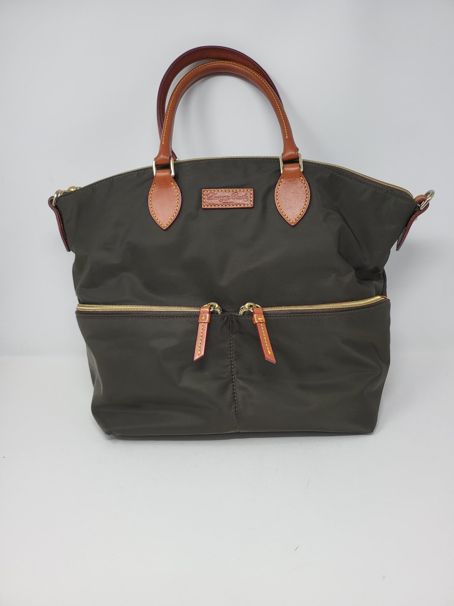 Dooney & Bourke, deep olive green nylon tote with tan leather handles and zipper pulls. Measures 12" wide x 13" tall x 5" deep. Comes with a blue drawstring dust bag and detachable long adjustable leather strap. Like-new condition.