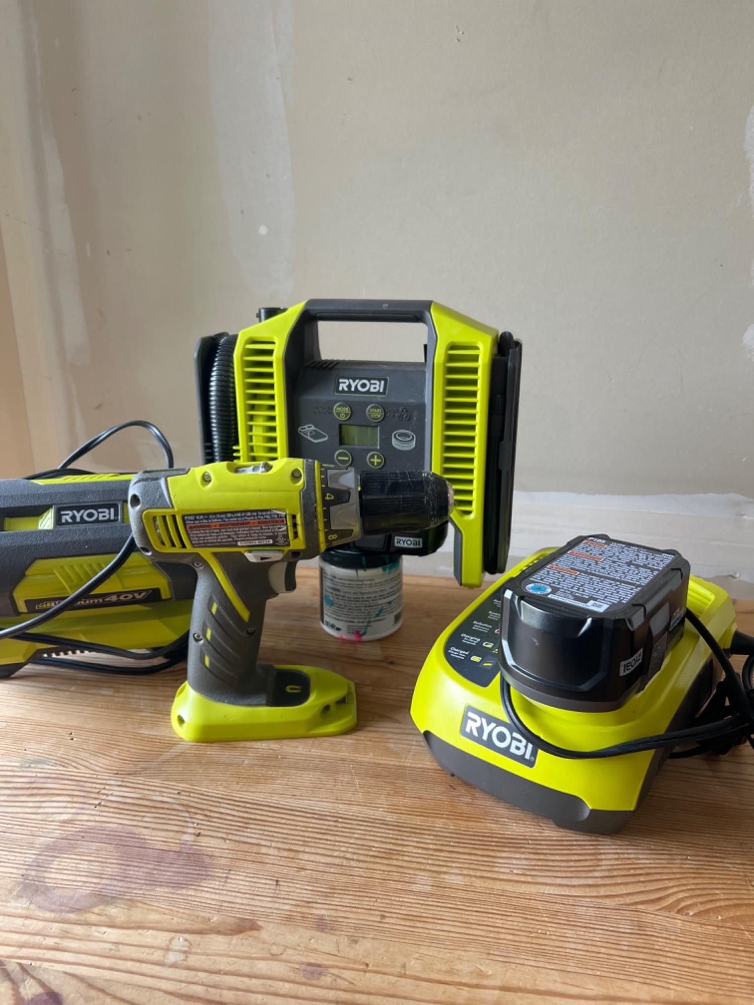 Ryobi P202 drill with battery and battery charger. Also included are a few containers of drill bits. Sears Craftsman Belt Sander with attached dust bag. Model No. 315.11751 Ryobi P747 inflator Extra Ryobi charger and battery OP4026.