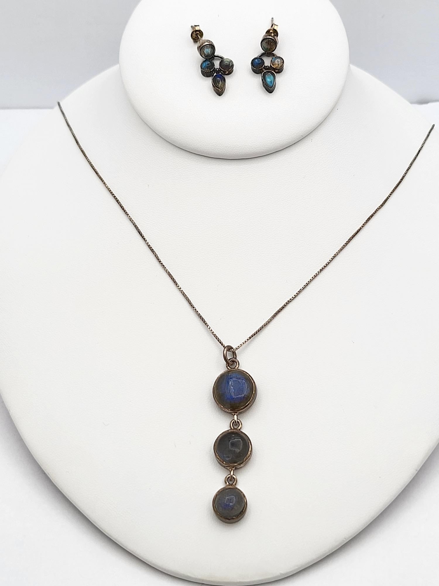 Labrodite three stone pendant necklace and post earrings set in 925 silver with silver chain. Total weight is 11.7 grams.