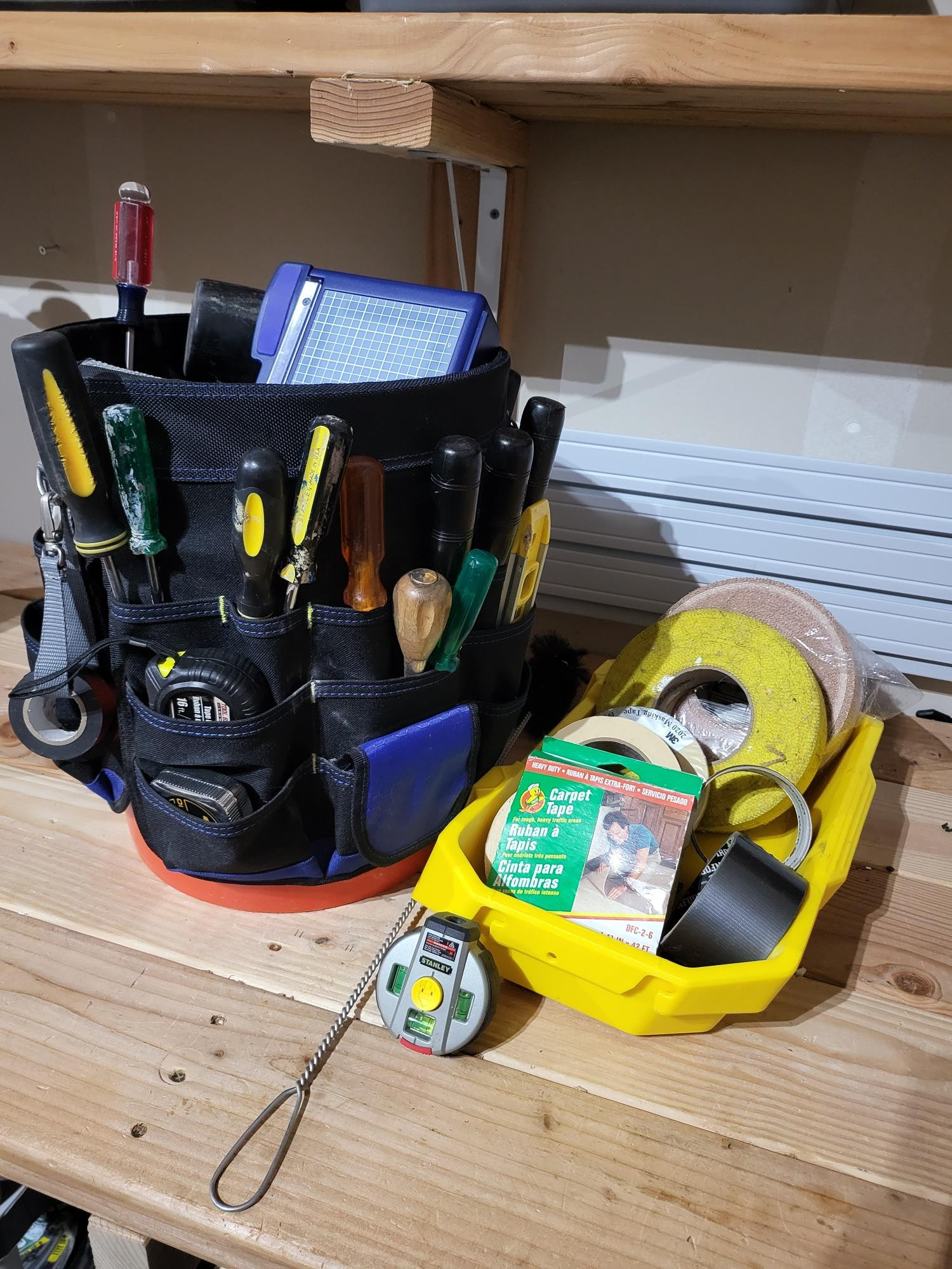 Kobalt tool organizer tote with inside area that can be used to store or carry more tools or to fit a bucket into for quick shop cleanup. Filled with miscellaneous useful tools. screwdrivers, mallet, hand sanders, pliers, measuring tape, levels, and various types of tape plus much more.