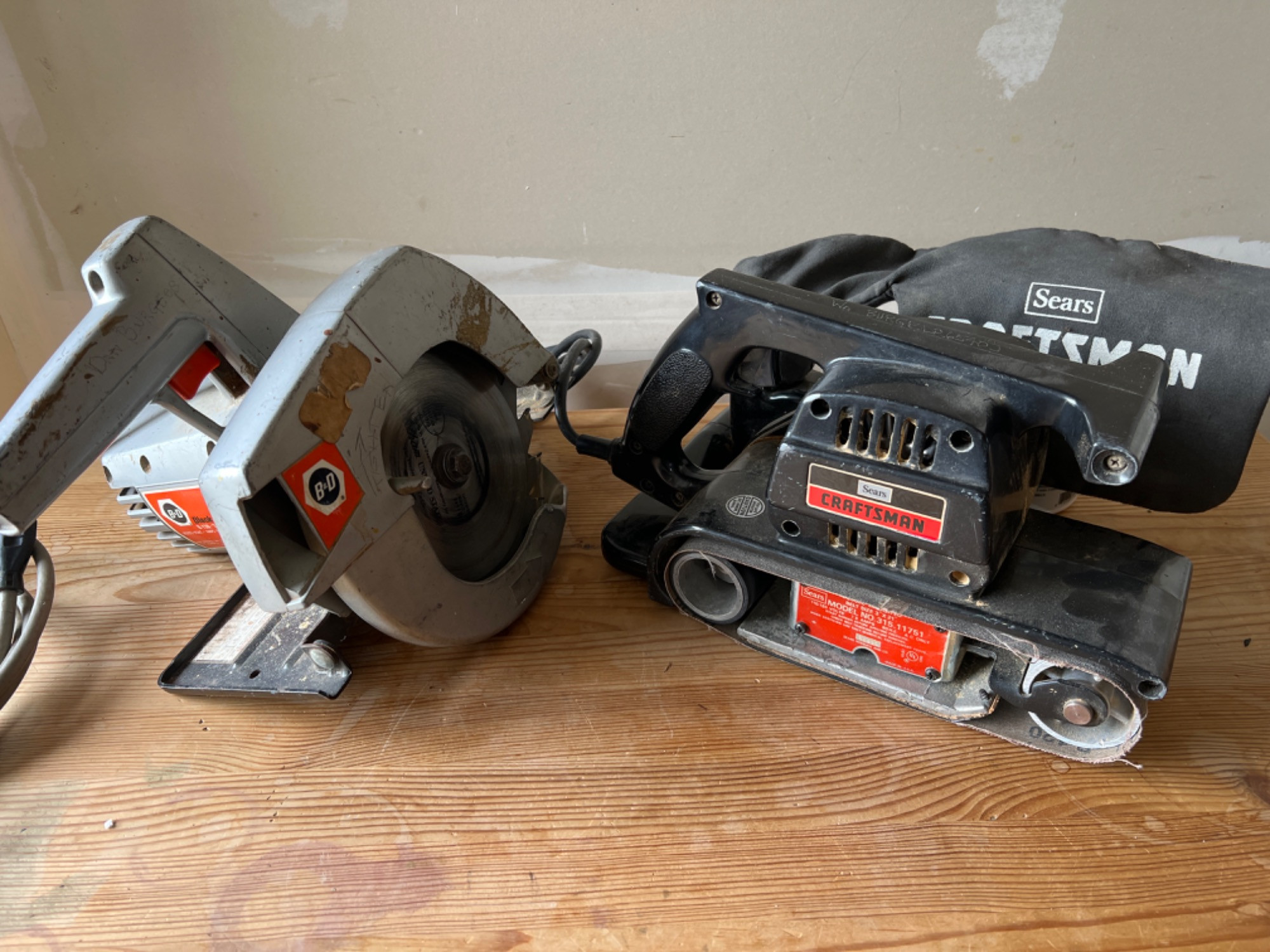 Black and Decker U-130 Skill Saw, works great. Craftsman Model No. 315.11751, Sears, Belt Sander with dust bag.