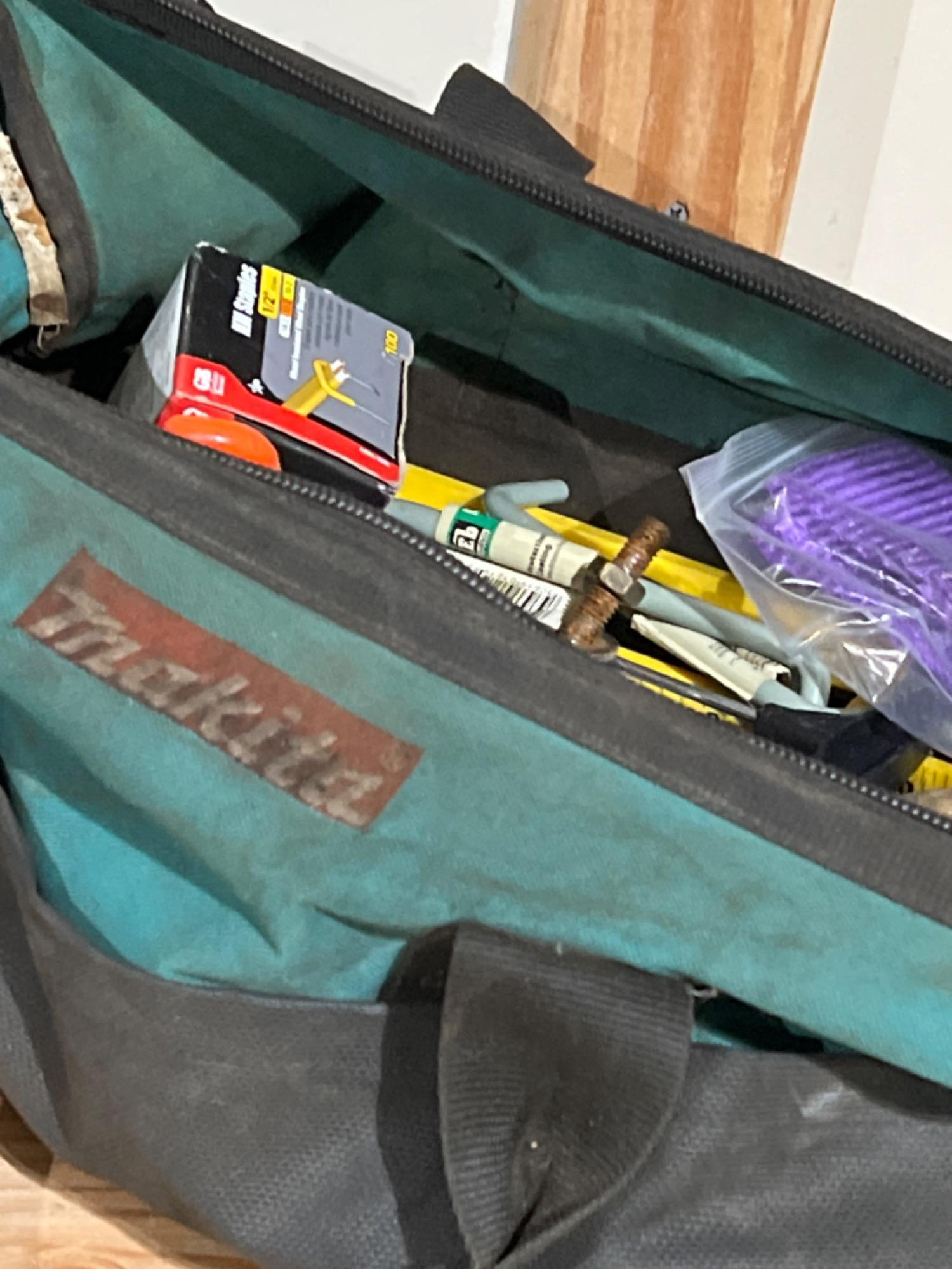 Zip-up Makita "toss and go" tool grab bag filled with various tools from chisels, screwdrivers, wrenches, level, and packages of unopened hinges and other hardware - plus more.