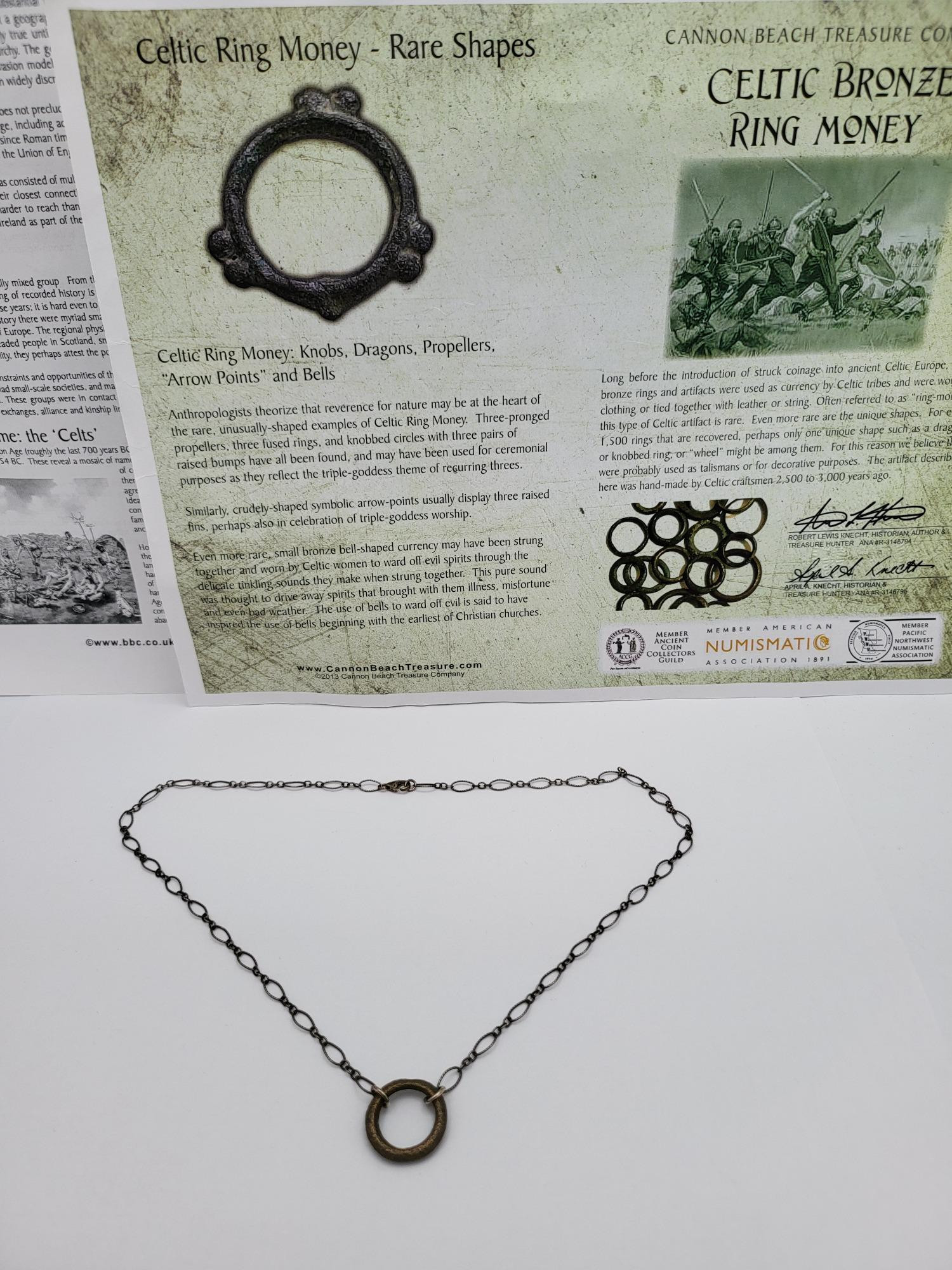 Celtic Ring Money dates from approximately 1,000 to 500 BC, when these sturdy bronze rings were traded as currency amongst the Celtic tribes of Northeastern Europe, and later, Scotland, Shakes and Ireland. This particular recovered hand-made Celtic artifact, is presented by the Cannon Beach Treasure Co, Oregon, on a 16" 925 sterling silver chain to be worn and loved in modern times as a reminder of the craftsmanship made by cultures of long ago. This rare piece comes with a historical brief of Ancient Britain and COA, describing how these coins were worn and what they were used for. Included is also a silk drawstring pouch.