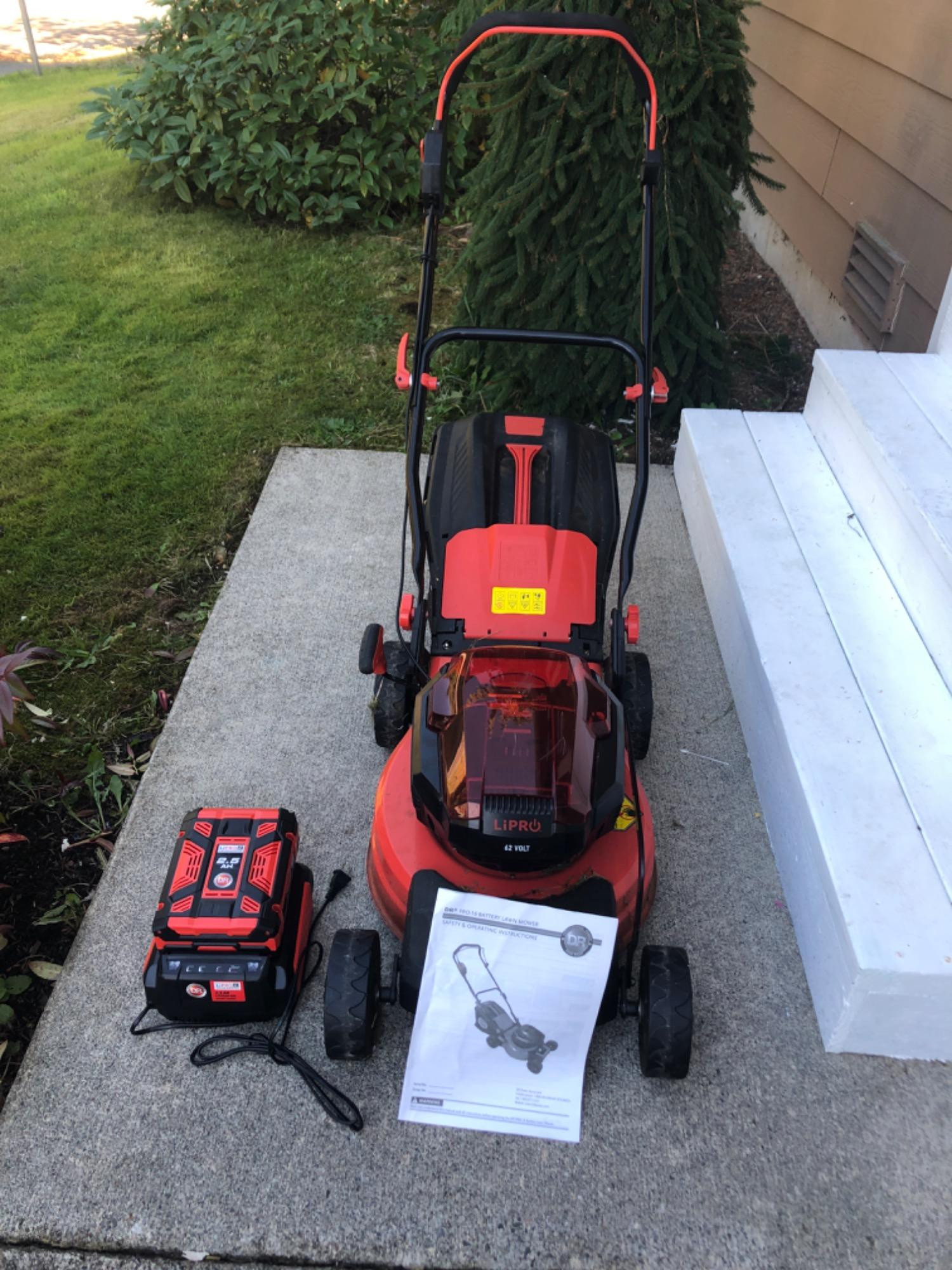 Easy to maneuver, Ergonomic Handlebar, One-Touch Height Adjustment, 62 volt, 16” Wide Blade, in working condition. Includes 2.4 AH Lithium-Ion battery and charger and manual. Easily starts and runs very well.