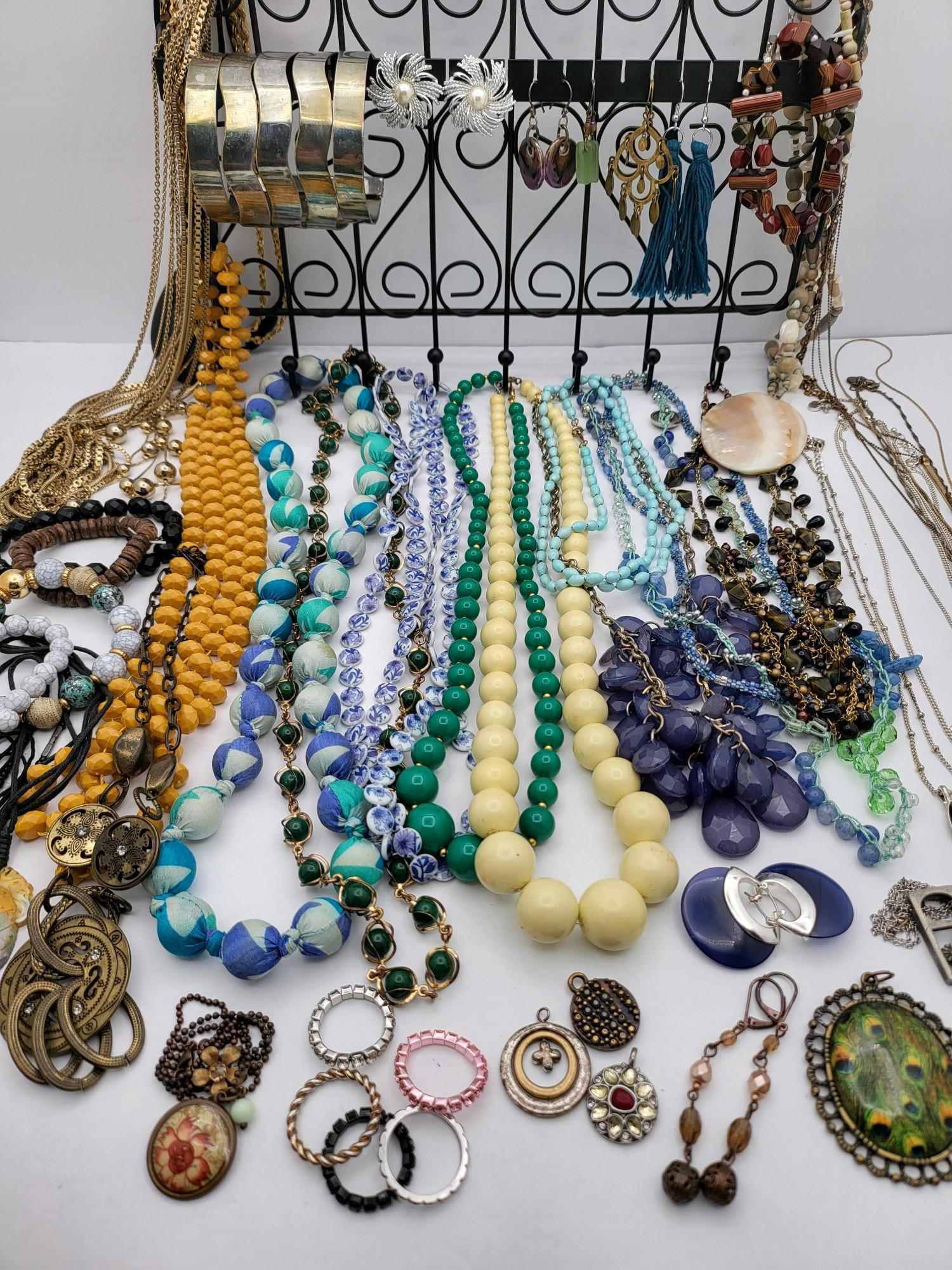 Fashion jewelry of various colors, styles, metals & materials. Beaded and chain necklaces, bracelets, earrings, rings, charms. Black metal hanging wall organizer is included. It measures 11.5" long x 8.5" tall.