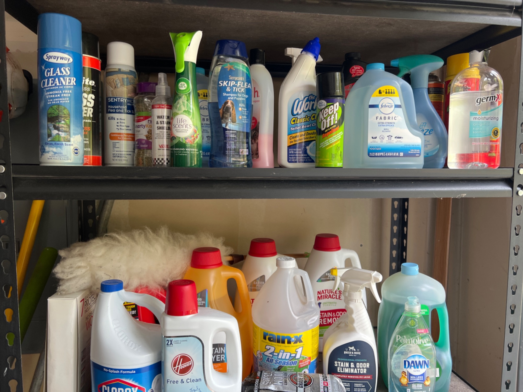 Variety or new and used bottles of cleaner and garden potting supplies. Everything you see in this lot's pictures. Does not include shelving. See Lot 129 to bid on industrial shelf.