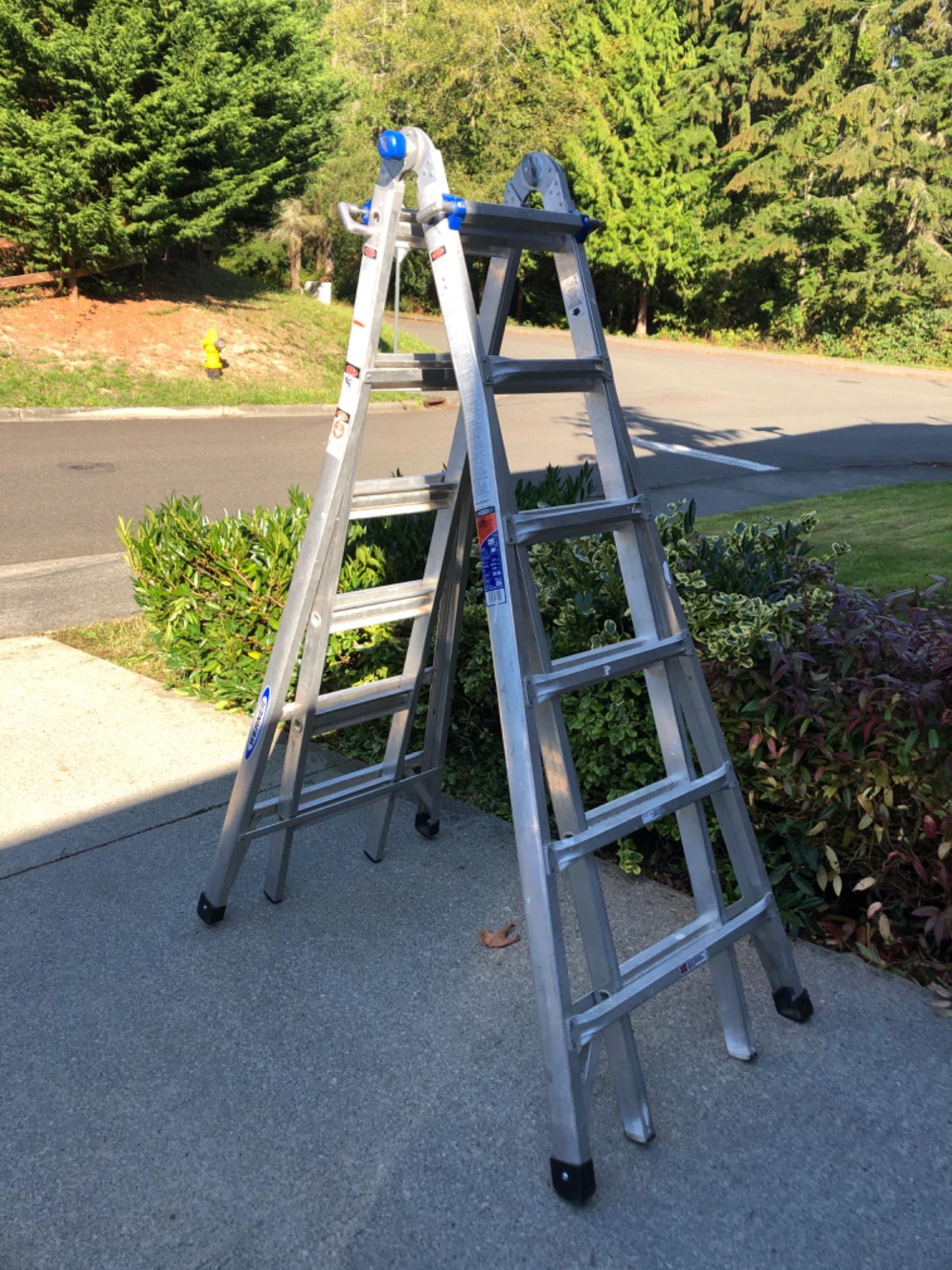 25 Foot Werner Folding Ladder. Ladder converts to the following: Step Ladder - 8' 7" height Extension ladder - 18' 11" length Scaffold - 4' 10" Holds 300 lbs.