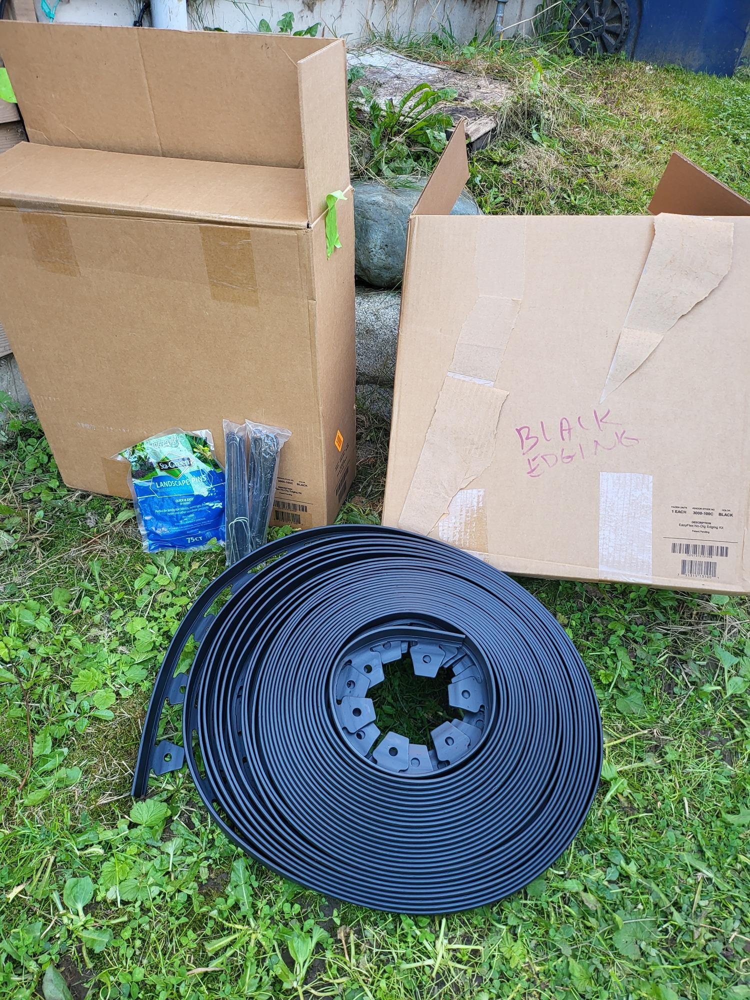 EasyFlex, no dig, edging sets - two long rolls, new in box. Come with pins and instructions. Uncertain of how many feet each roll has. Potentially between 25' to 50' per box.
