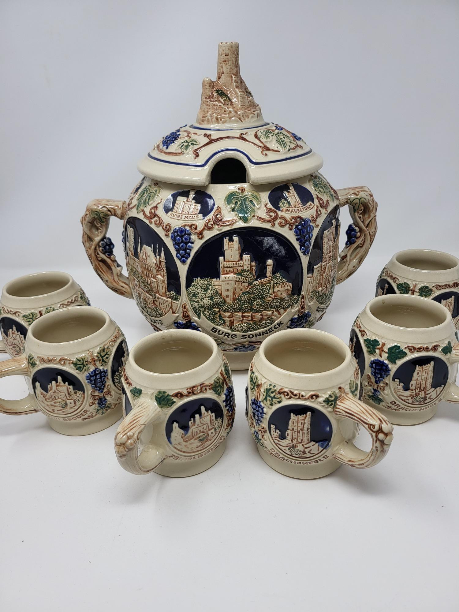 W. Germany pottery punch bowl with lid and 6 cups/mugs with handles. Cups are 3.75" tall with a 2.5" opening and 4" T at it's widest area including handle. Bowl measures 12" tall with lid on (7.5" w/lid off) and 11" wide handle to handle. Opening is 5.5" wide. Appears to have a small crack on lid at ladle opening.