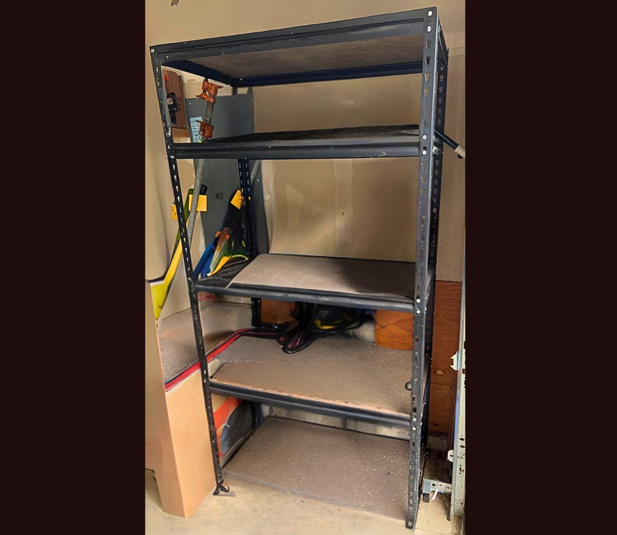 Steel industrial 5 tier shelving with textured wood shelf inserts.