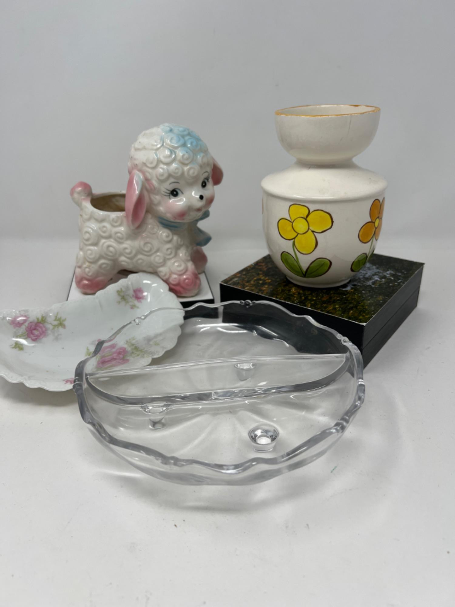 1960's popular yellow daisy 5" tall bud vase 1950's popular ceramic child's room lamb planter Antique Haviland France limoge tricket tray and a divided/footed glass candy dish (1930-40s)