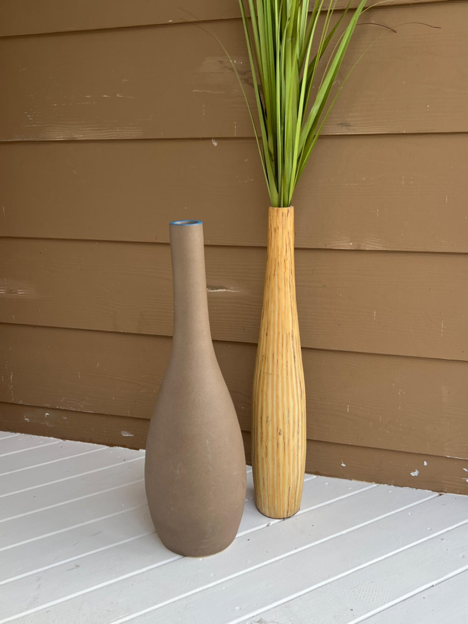 24” tall brown Ikea vase 25" tall slender bamboo style vase with 32" added height faux bamboo shoots.