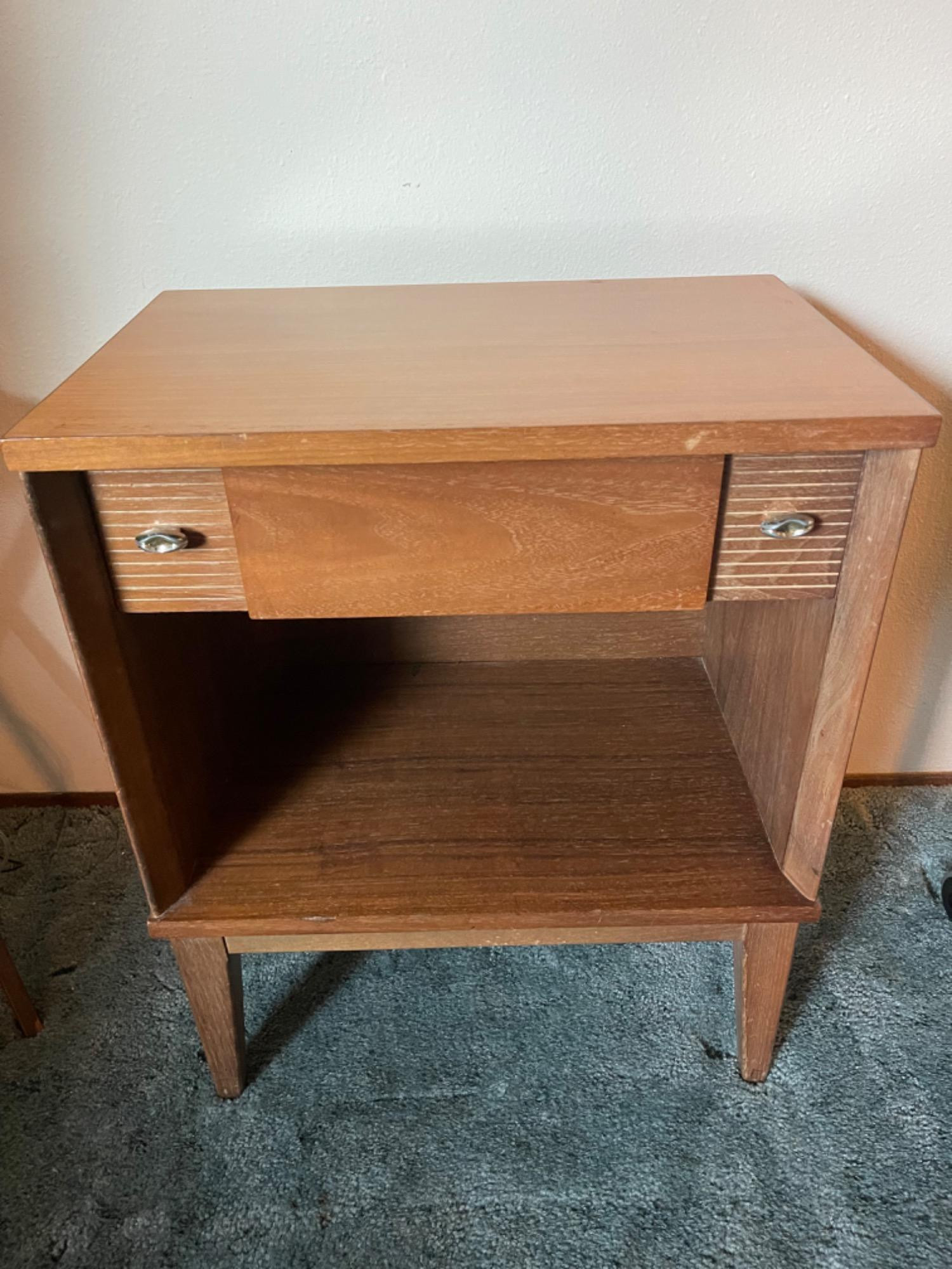 Mid Century Modern Bedside Table #1 Drawer has a lining that has been put in so wood is likely protected well underneath. Comes with a glass top. Good used condition. Some scratches, scuffs and staining which has been shown in photos.