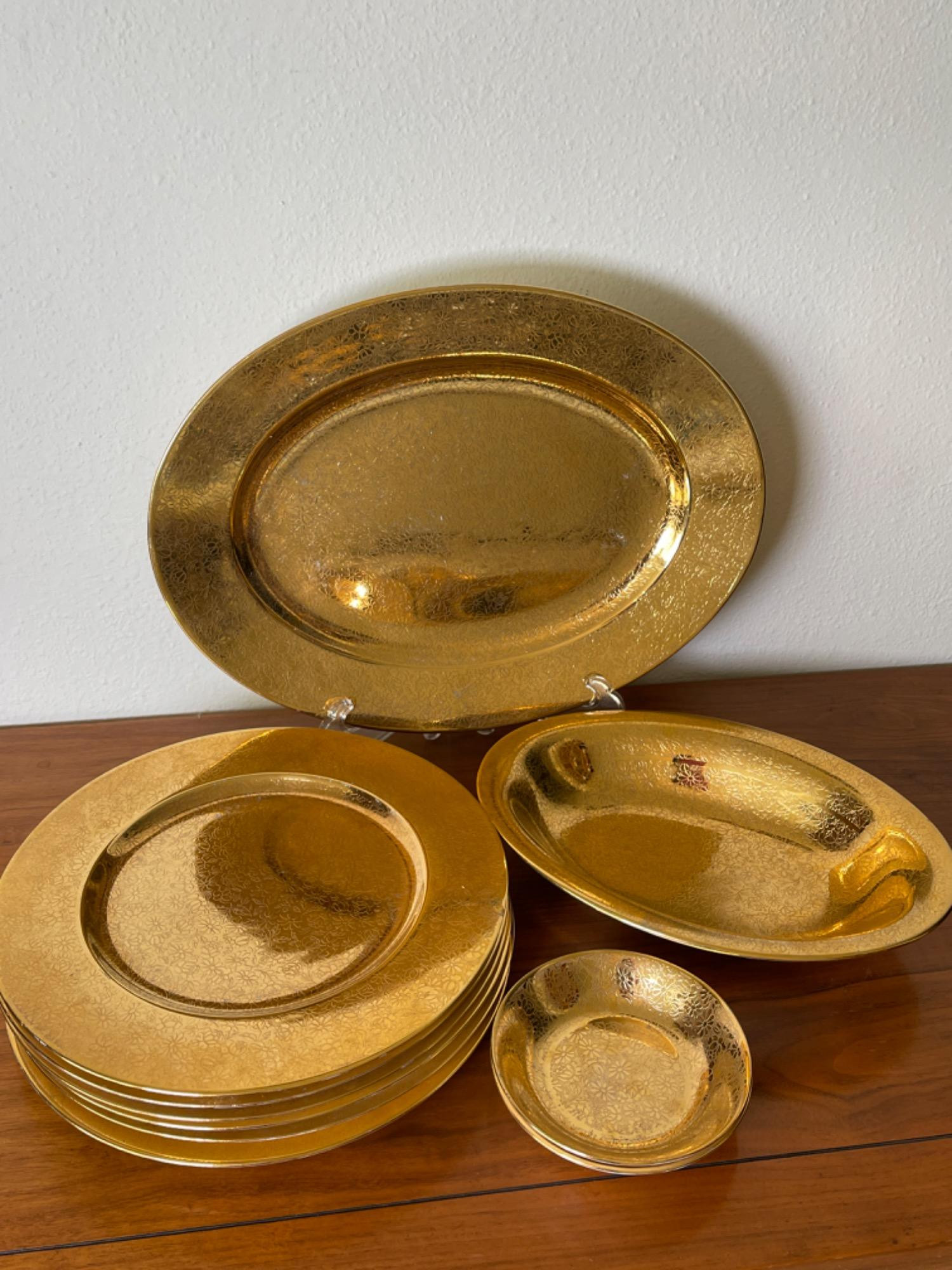 Vintage Warranted 22K Gold Plated China Set All have some tarnishing and scratching. One piece has a large crack on outer edge. Please see photos. Smallest: 5" W Largest: 15" W