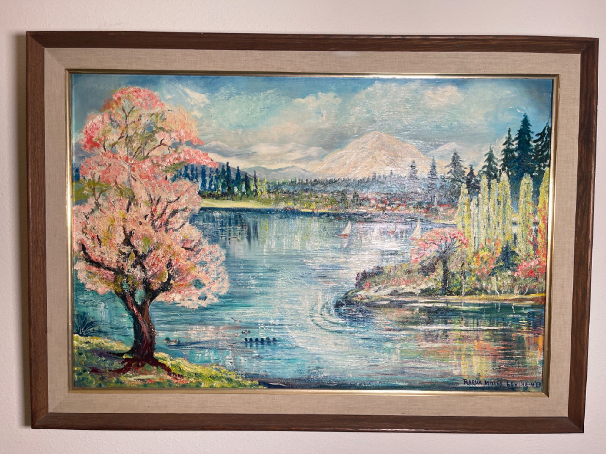 Beautiful Large Framed 1963 Painting By Reeva Miller Levine Both piece and frame in great condition. Minor scuffs and scratches to frame. IMPORTANT: We do NOT have a COA or any information about this piece. Sound Estate Company does NOT claim its authenticity.