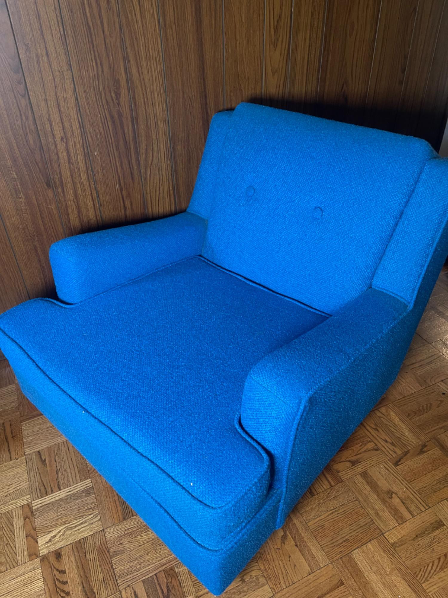 Mid Century Style Blue Armchair Good used condition, but this was in a PET household. Minor staining and snags.