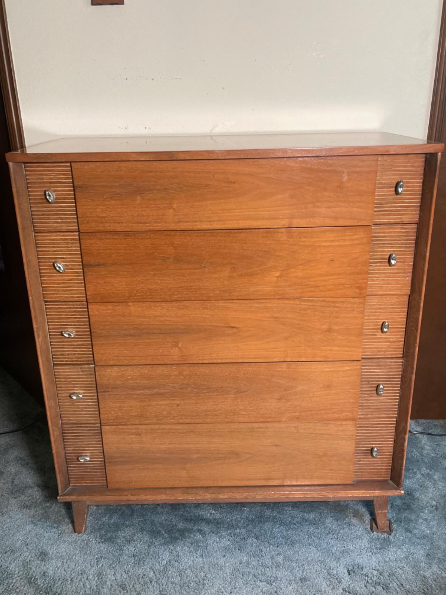 Beautiful Mid Century Modern Dresser Dove Tail Joints, original knobs. Three compartments in top drawer. Comes with a glass top. Has multiple scratches and scuffs from use. Dresser has multiple scratches and scuffs from use, but is in sturdy condition. Most drawers have lining that has likely protected wood underneath.