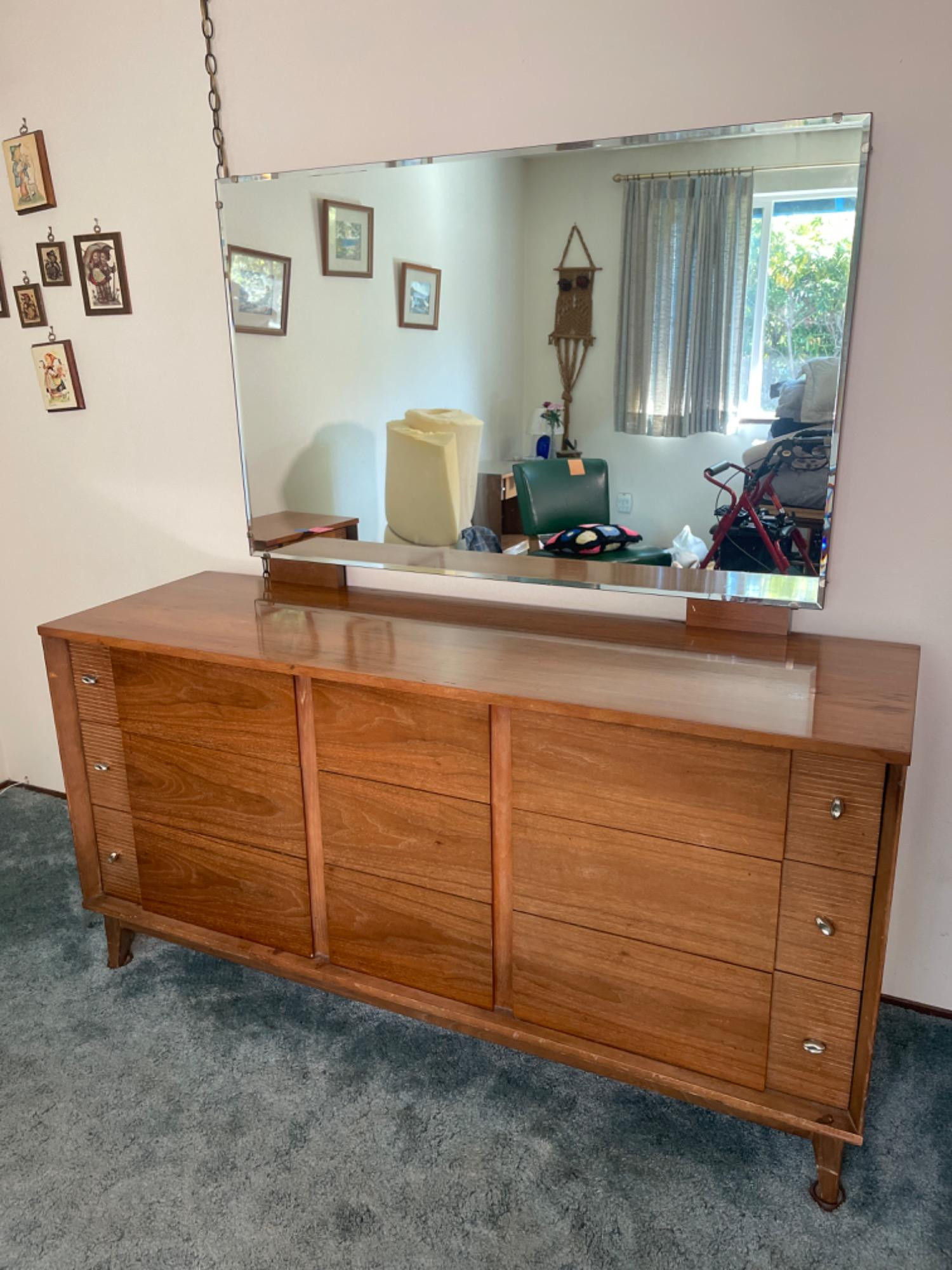 Mid Century Modern Dresser With Mirror Wood has multiple scratches, stains and scuffs. Please see photos. Most drawers have a lining inside, so wood has likely been preserved and protected. Mirror has some scratches and scuffs which have been shown in photos as best as possible. Dresser: 60" L x 19" W x 30.5" H Mirror: 48" W x 30" H