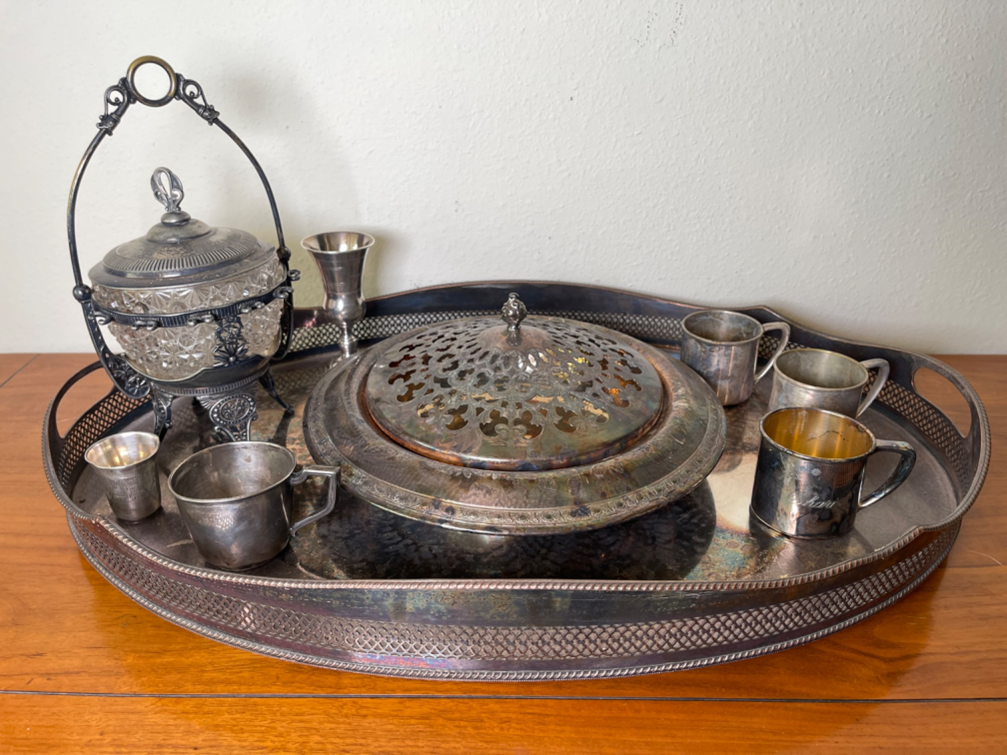 Vintage Silver On Copper and Silver Plate Pieces All have significant tarnishing, staining and scratches from use and age. Please see photos. Largest: 24.25” W Smallest: 1.5” W