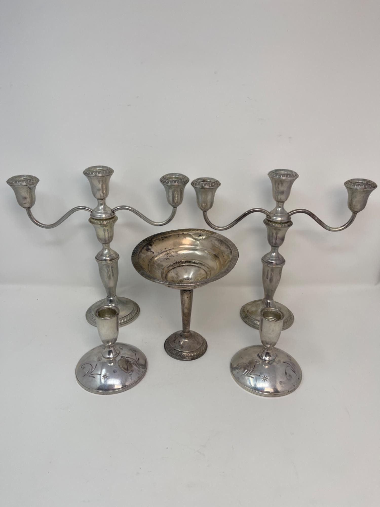Assortment of Sterling Silver FILLED Reinforced All have tarnishing and staining from age. See photos. Tall Candlesticks: - Cement filled - 9.5” H - Weights: Goblet: - Unknown filling - 6.5” H - Weight: 5.8 ounces Short Candlesticks: - Reinforced with rod of another metal. - 3.5” H - Weights: