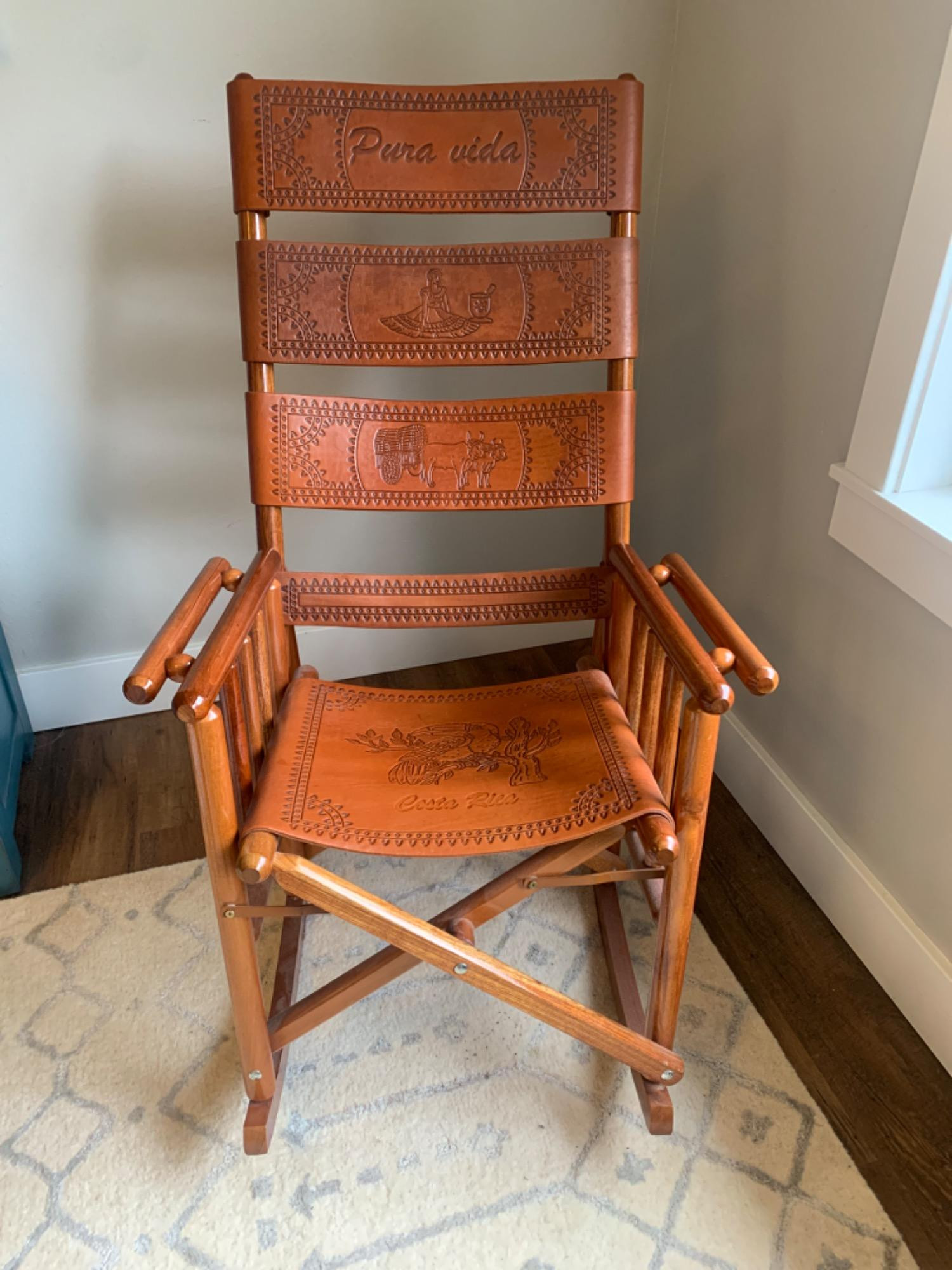 Identical to lot #4. Quality craftsmanship from Costa Rica. Handmade rocking chair with tooled leather detailing. Unique piece for any room.