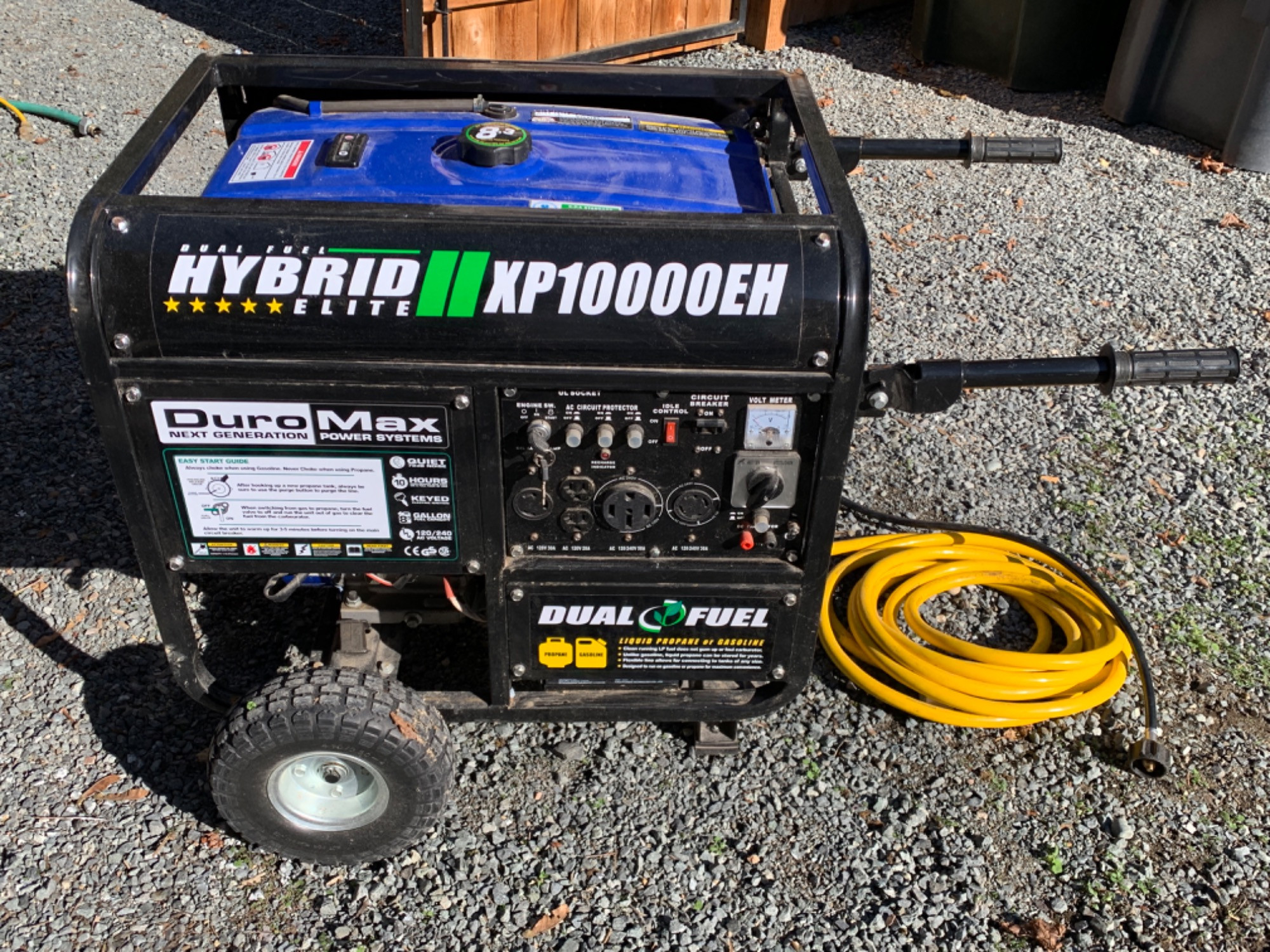 Newer hybrid generator. Dual fuel options for gas and propane. Powered up. 18hp, 8-gallon tank. 120volt service. Heavy duty power cord included
