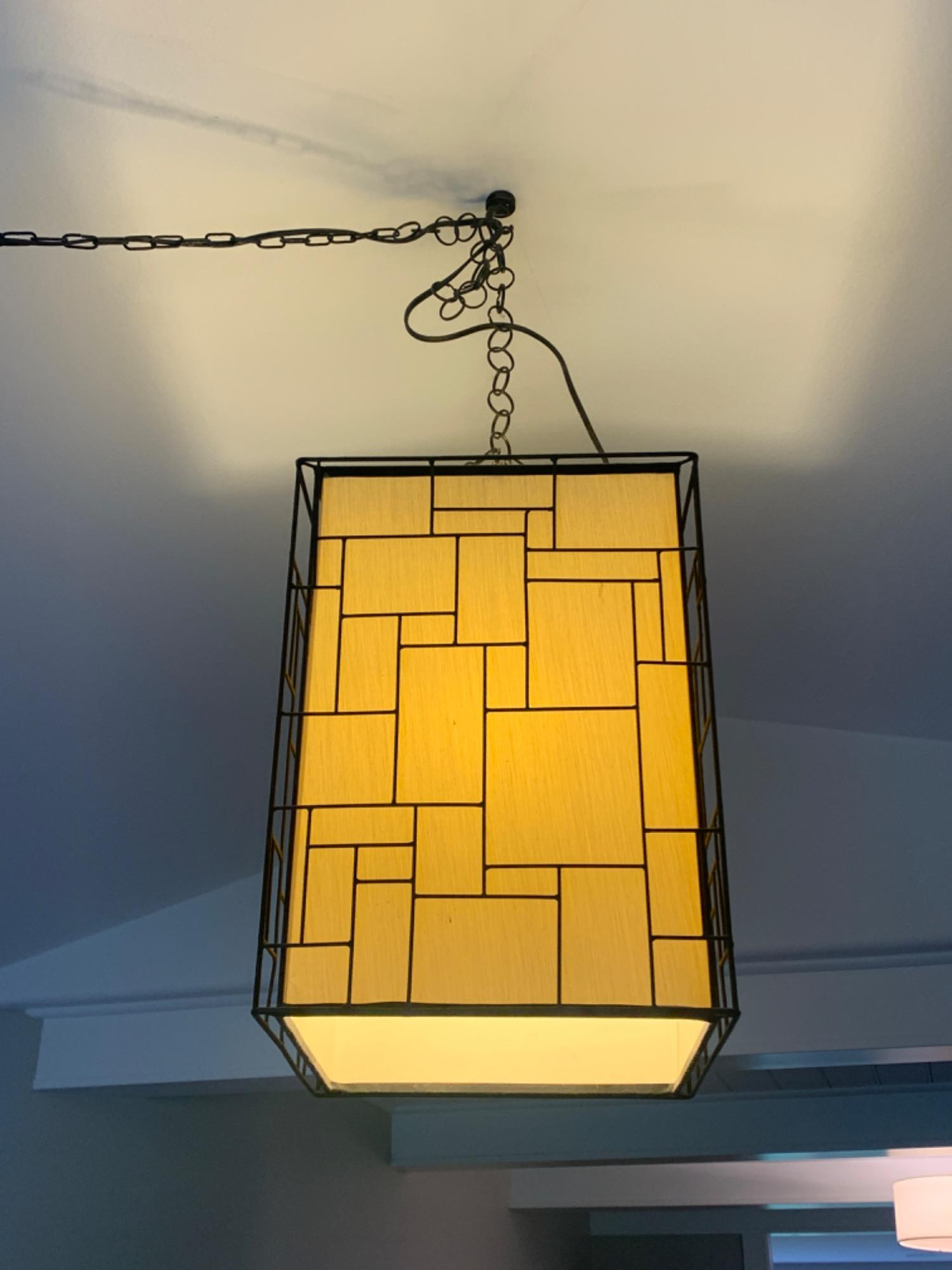 Metal light fixture with plug in. Modern geometric design. Maker unknown. Cord length is approximately 20ft.