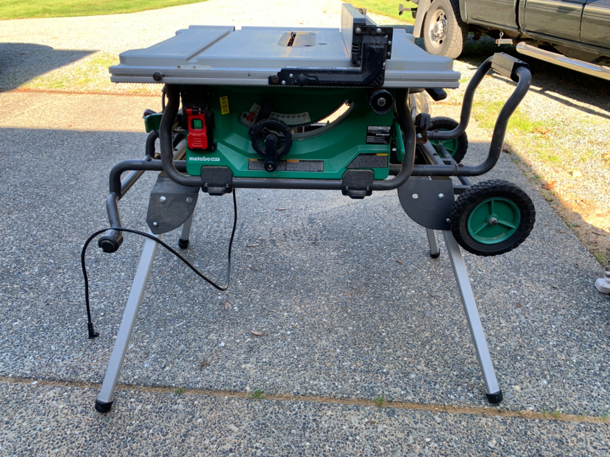 Metabo 10in jobsite table saw. Model C10RJ(S) Collapsible rolling table stand. Wood table extender included with 2 rails. Powered up. Easy load location.