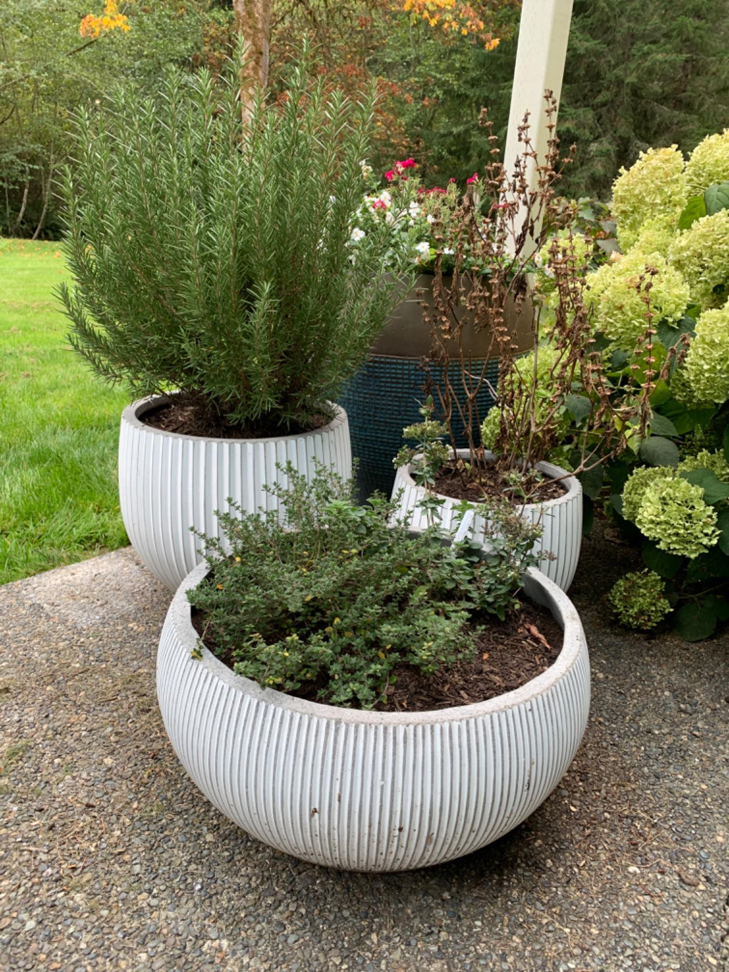 Great set of white clay pots. Filled with live plants (one may be a goner). Heavy and filled with Rosemary and another plant. Plants health cannot be guaranteed on pick-up day. Bring handcart and help to load. Dimensions are for largest pot. Variety of sizes and shapes.