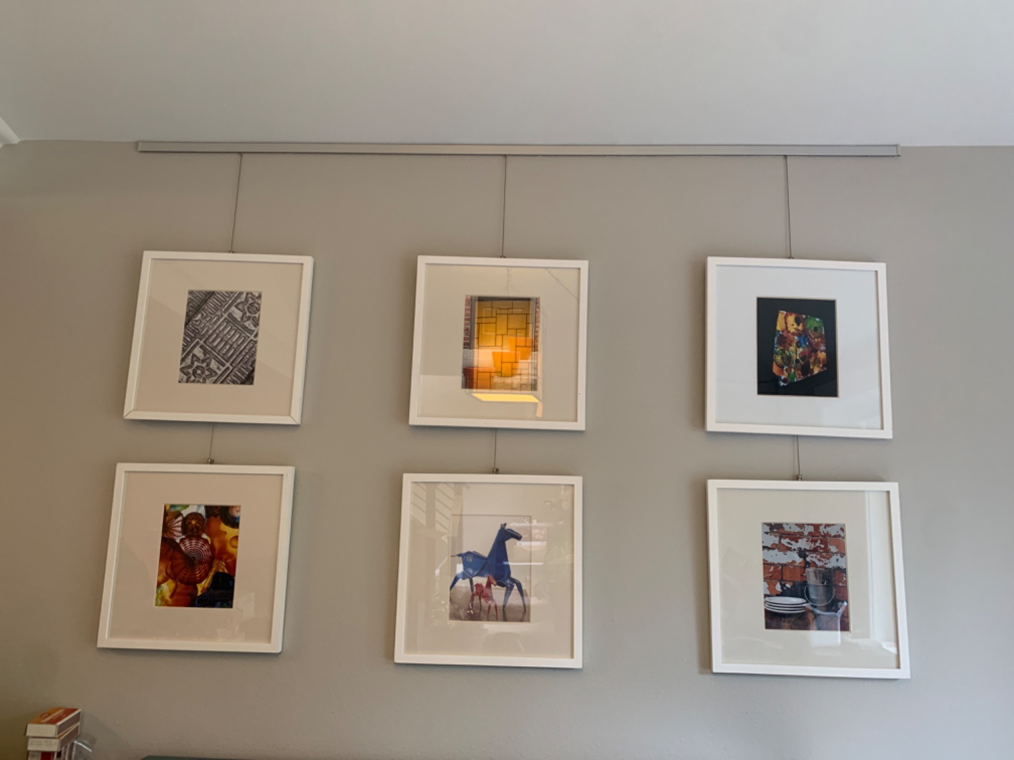Six framed photos. Modular mounting system with cables that slide. Slim design. Bracket has been removed and ready for pick-up. Extra Cables added.