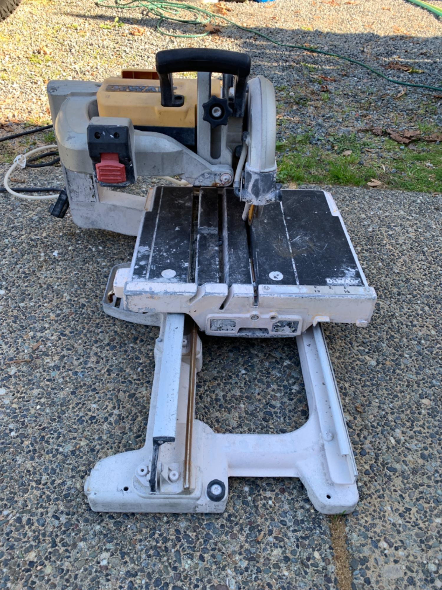 Dewalt tile cutter/wet saw powered up. Model number could not be found. Water hose attached. Plastic tray included later with tray support frame.