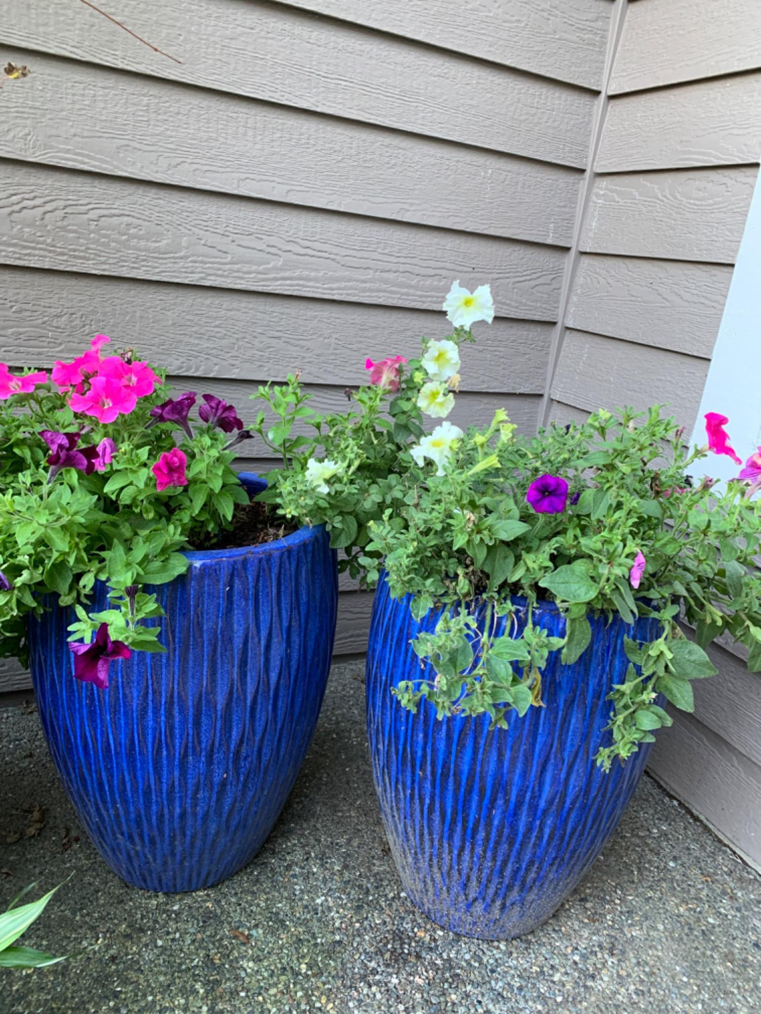 Plant condition not guaranteed at pickup. Heavy clay pots with live plants. Indigo blue color. Glazed on exterior.