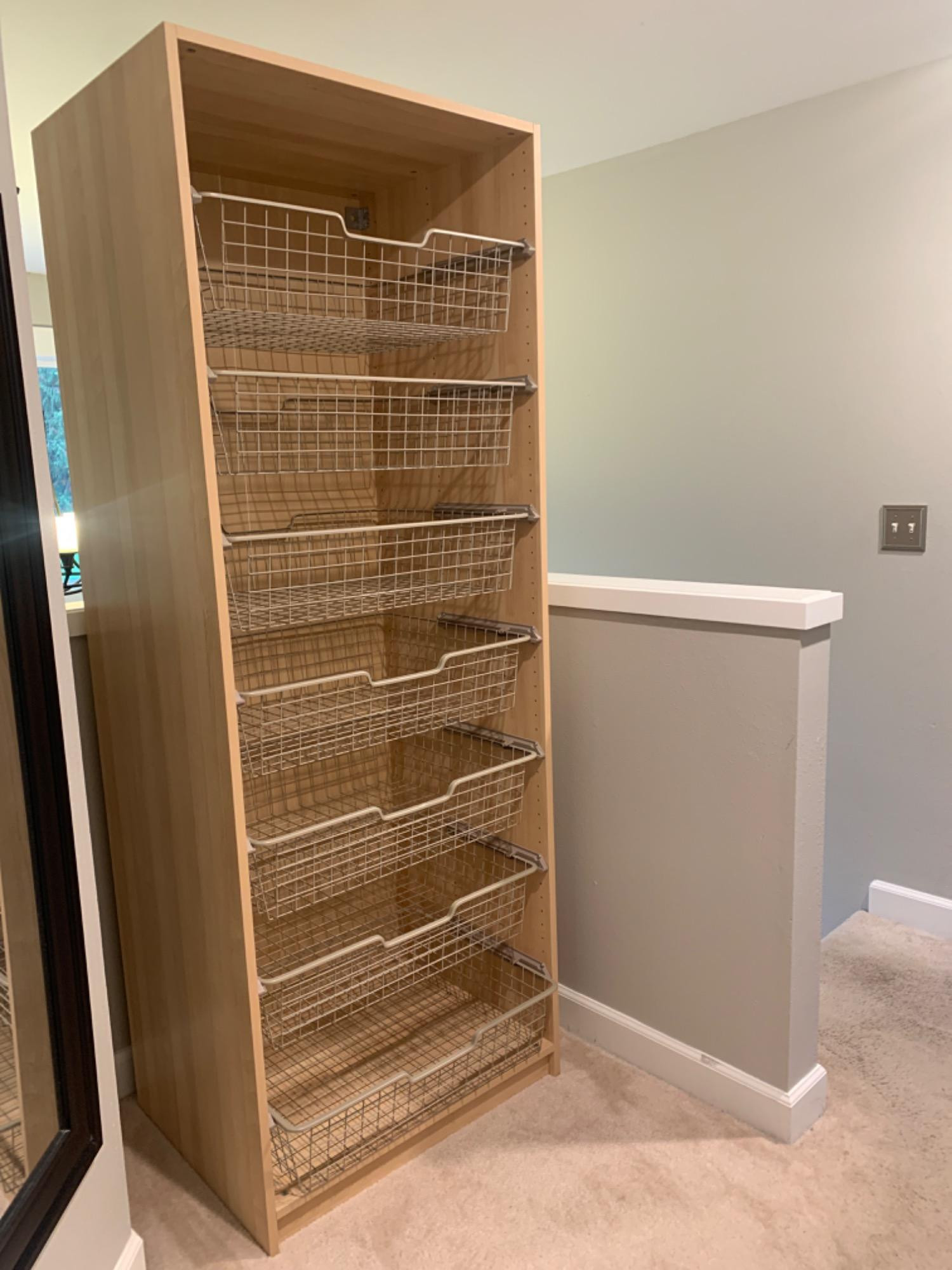 Large wood storage unit with metal baskets. Baskets are adjustable. Glide out smoothly. Heavy. Bring tools and help to load.
