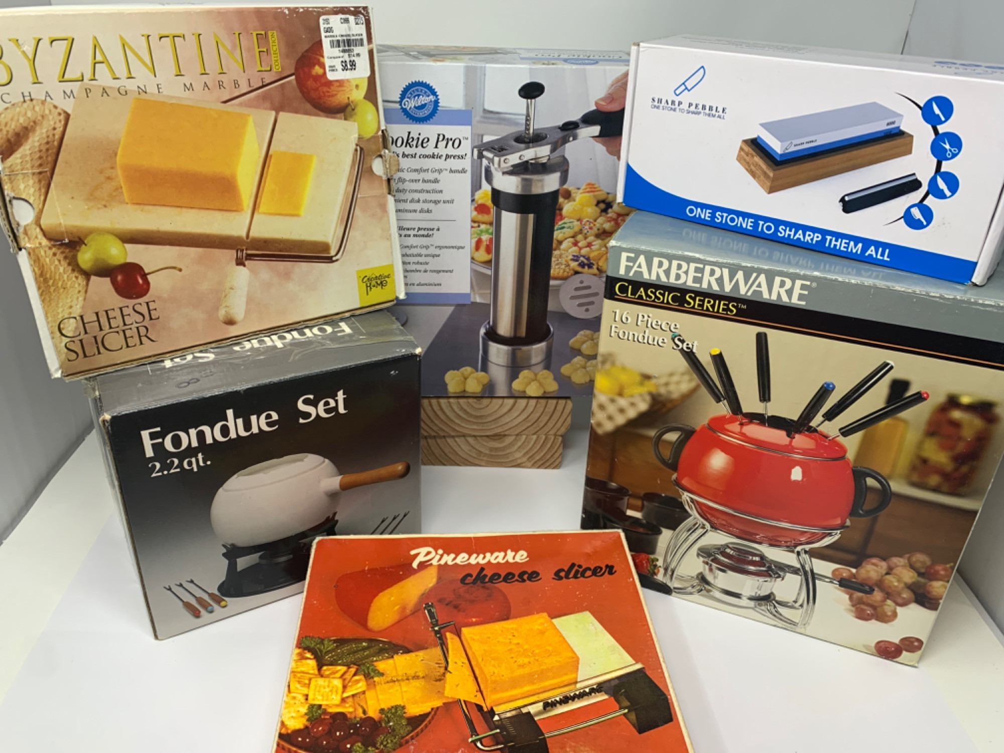 Vintage fondue pots and kitchen items. NIB-Cookie press, cheese slicers. Sharpening stone.