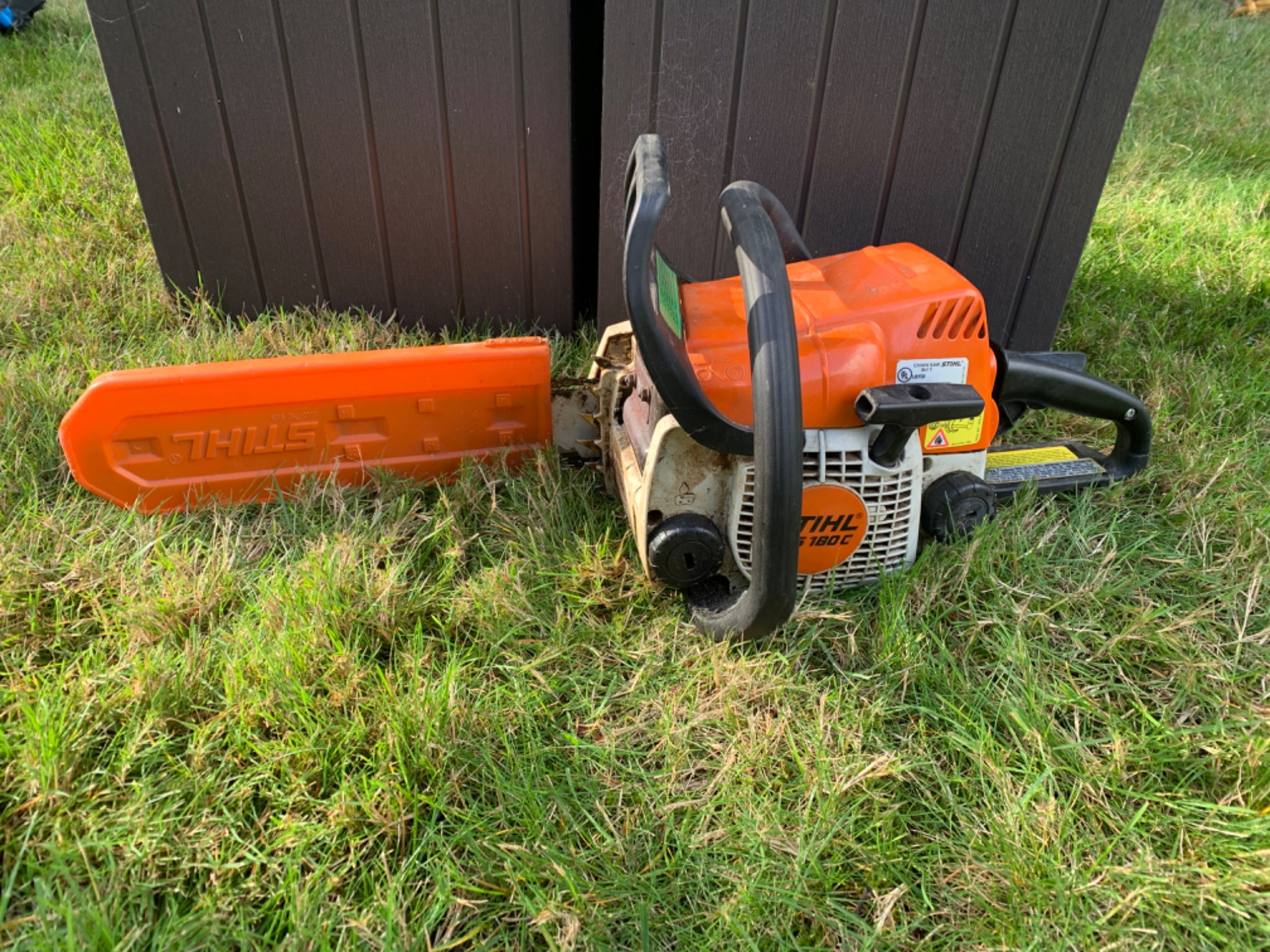 Stihl 13in chainsaw. Model MS 180C. Powered up. includes a blade cover.
