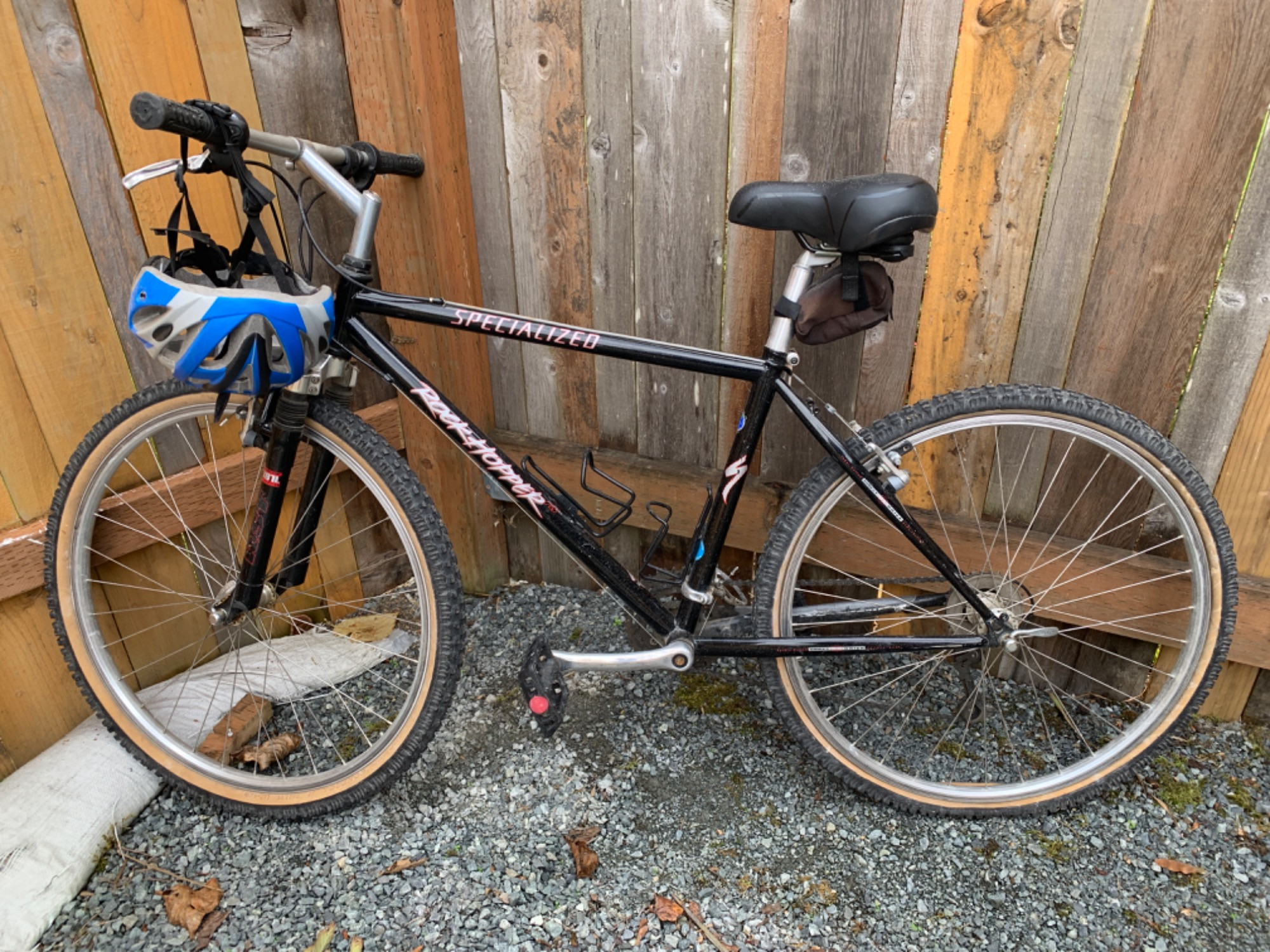 Rock Hopper specialized mountain bike with helmet. 26in wheels. Nice cushion seat.