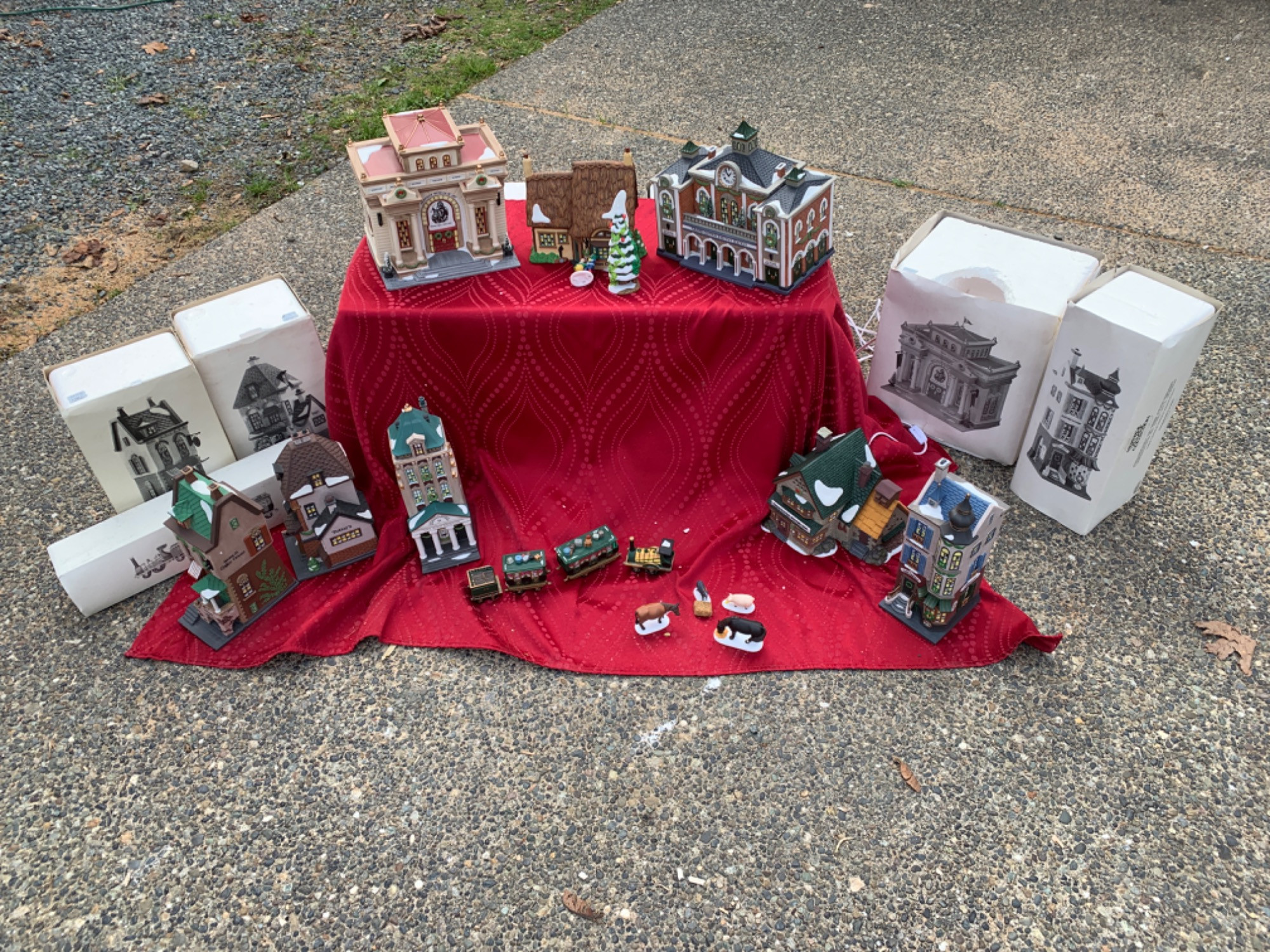 Popular Department 56 Christmas village structures and accessories. Includes original boxes. Train, tree and animals included. One structure tested and powered up. Loads of charm, detail and character.
